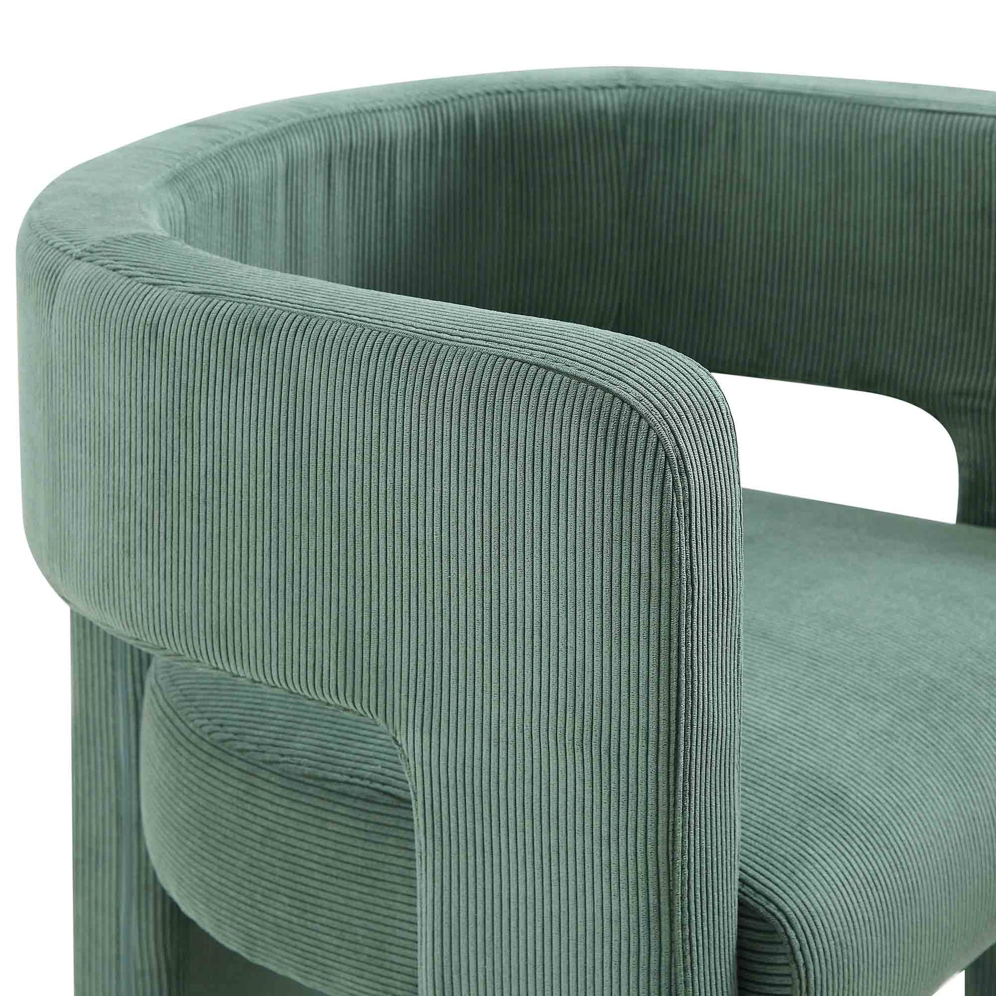 - Well-cushioned seat and lovely corduroy fabric upholstery in sage green shade makes the chair an ideal chic choice for modern interiors.