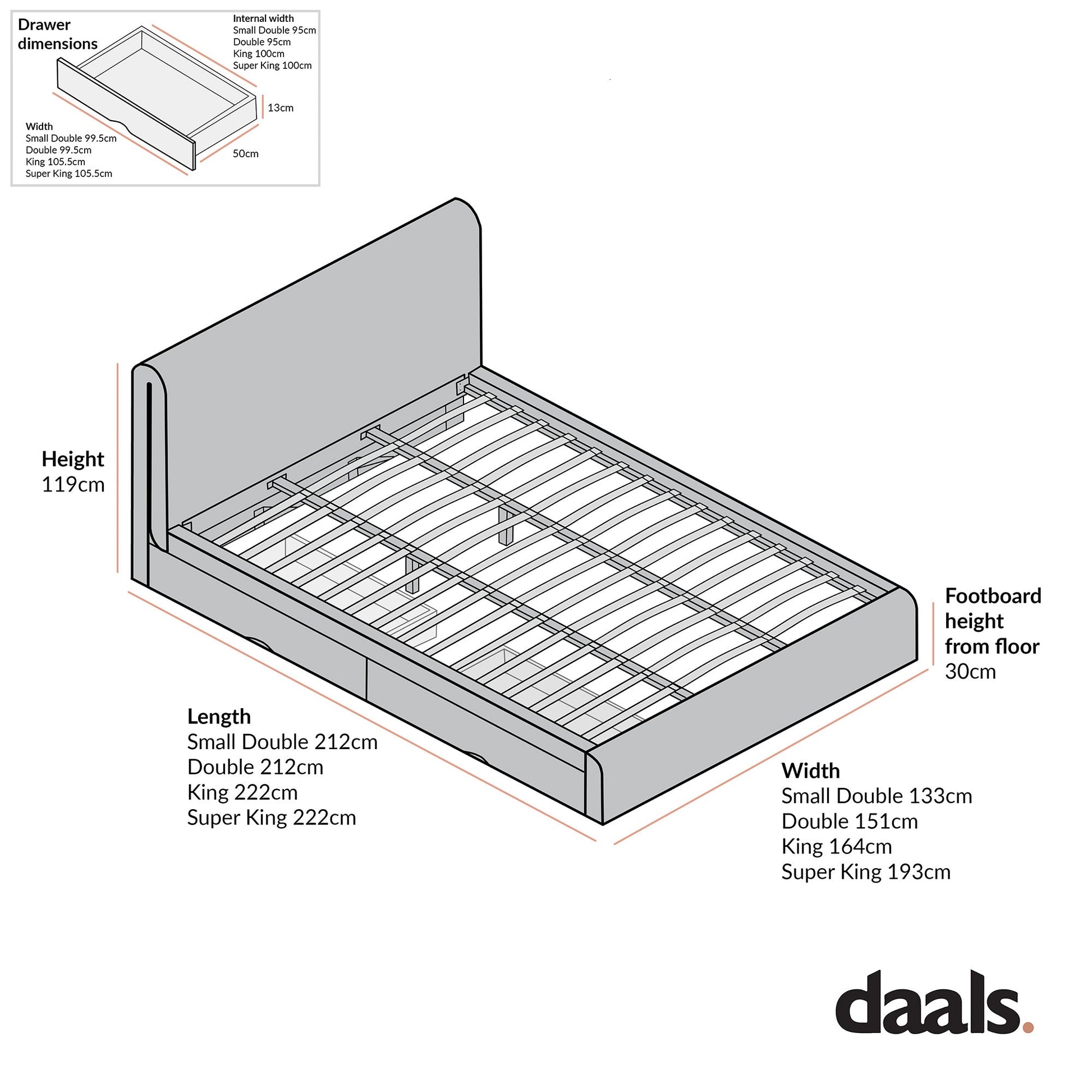 - Drawers for Small Double, Double Bed: W 99.5 x D 50 x H 19.5 cm