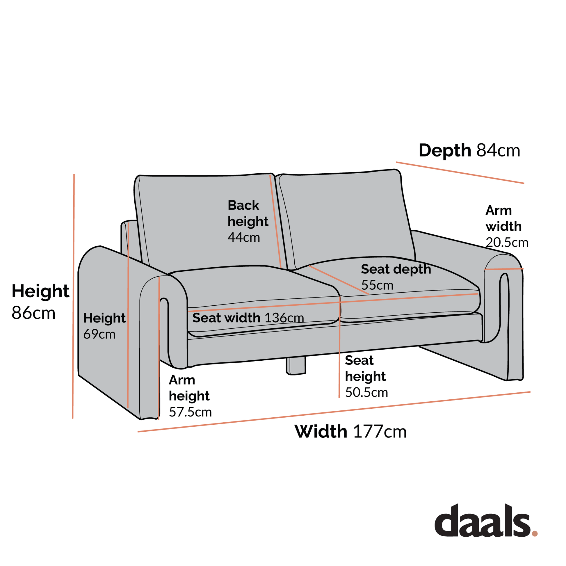 - Size: W 177 x D 84 x H 86 cm. Seat height: 50.5 cm.