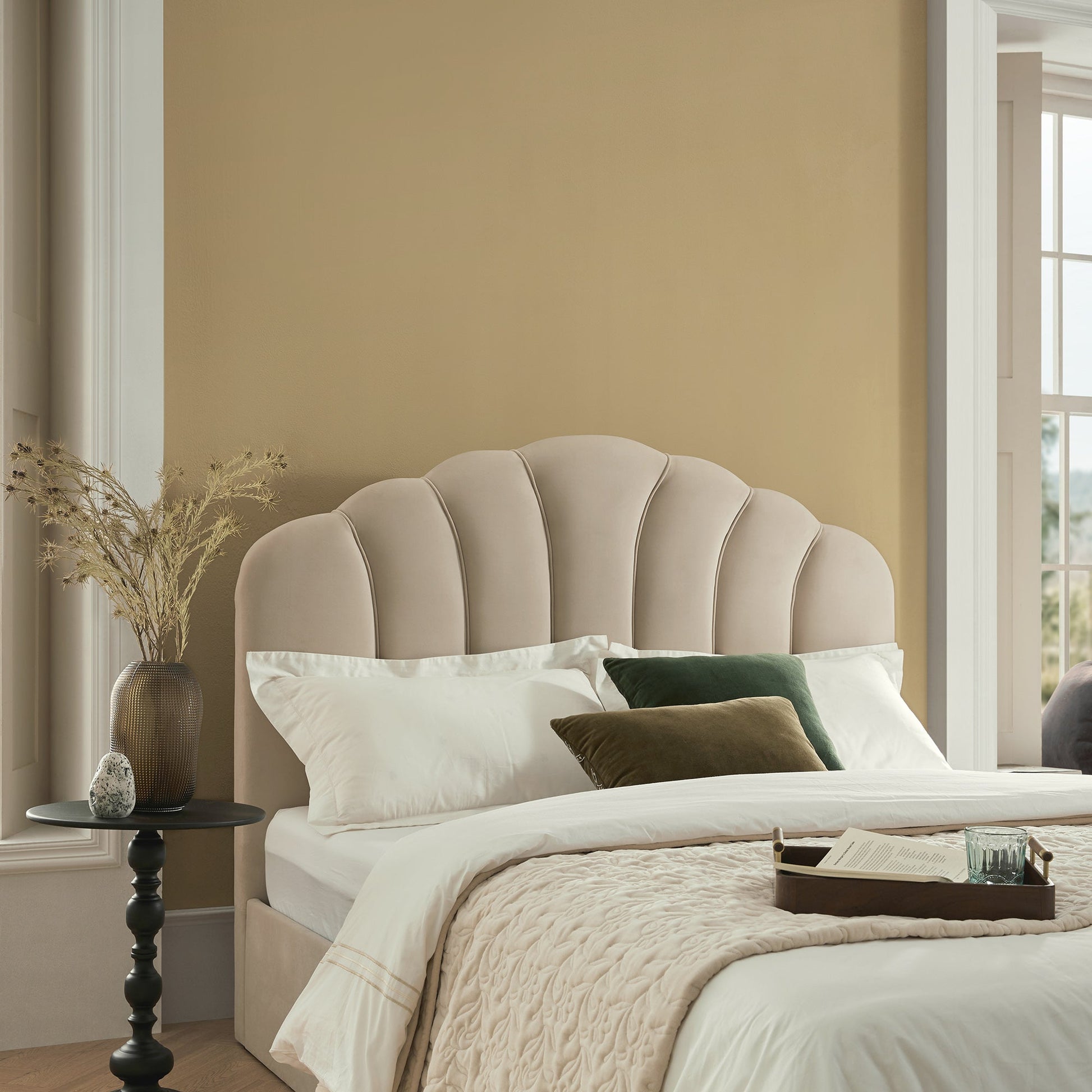 - The scalloped headboard, with its gentle vertical panelling, creates a refined silhouette that anchors the room with ease.