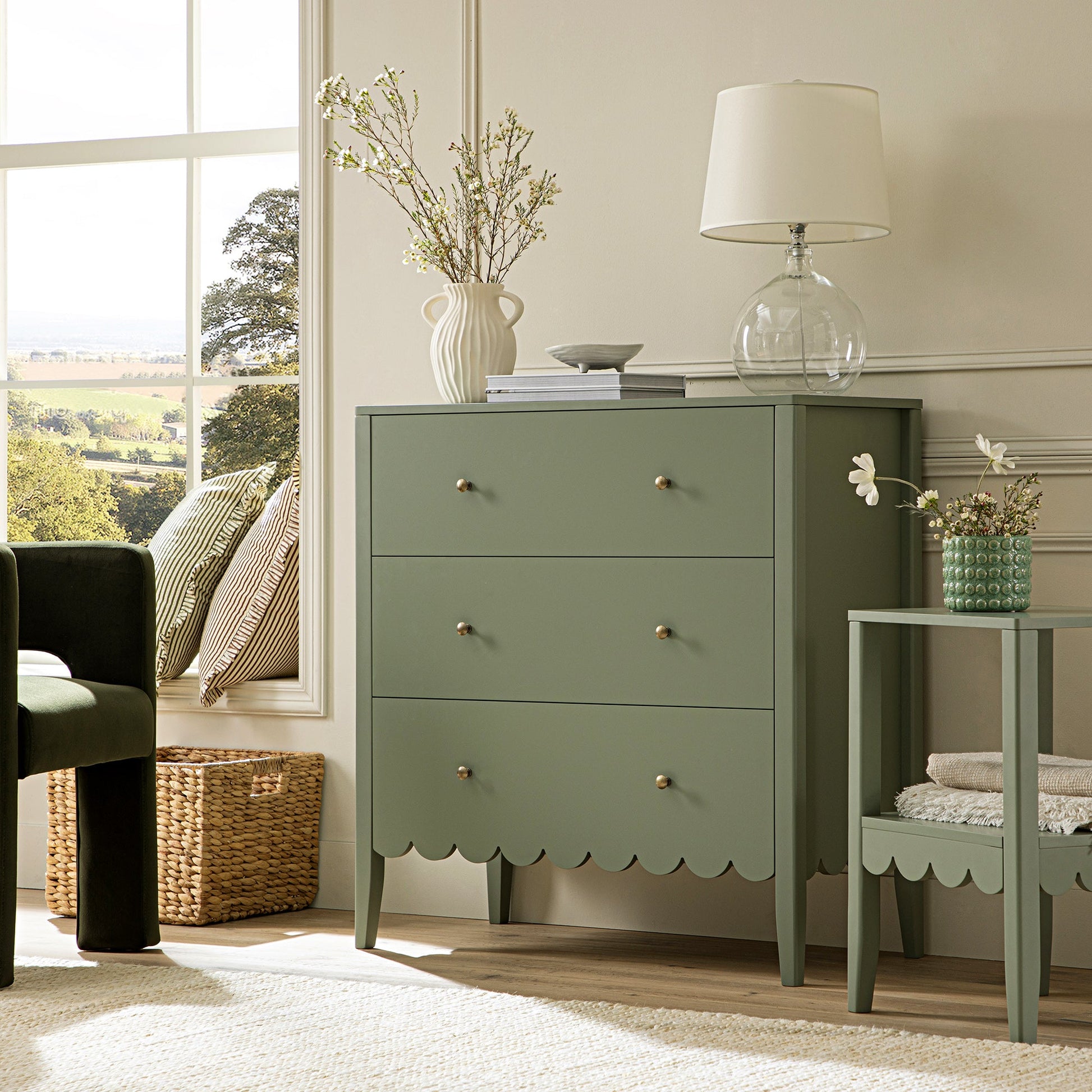 - Complete the look: Pictured with the Henley Sage Green Scalloped Edge 3 Drawer Chest is our Aurora Hand Braided Cream Jute Rug, Greenwich Moss Green Velvet Dining Chair and Iris Ticking Stripe Seersucker Frill Cushion in green and brown.