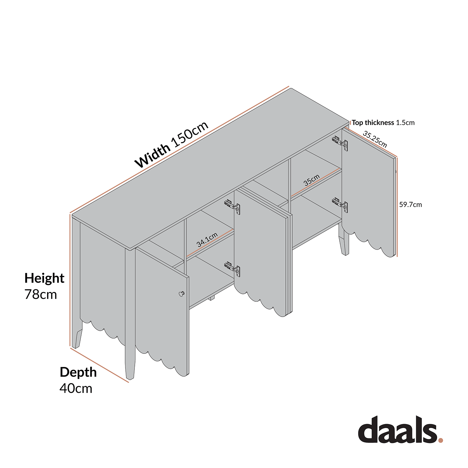 - The 150cm wide sideboard has 4 doors opening to plenty of storage, with height-adjustable internal shelves.