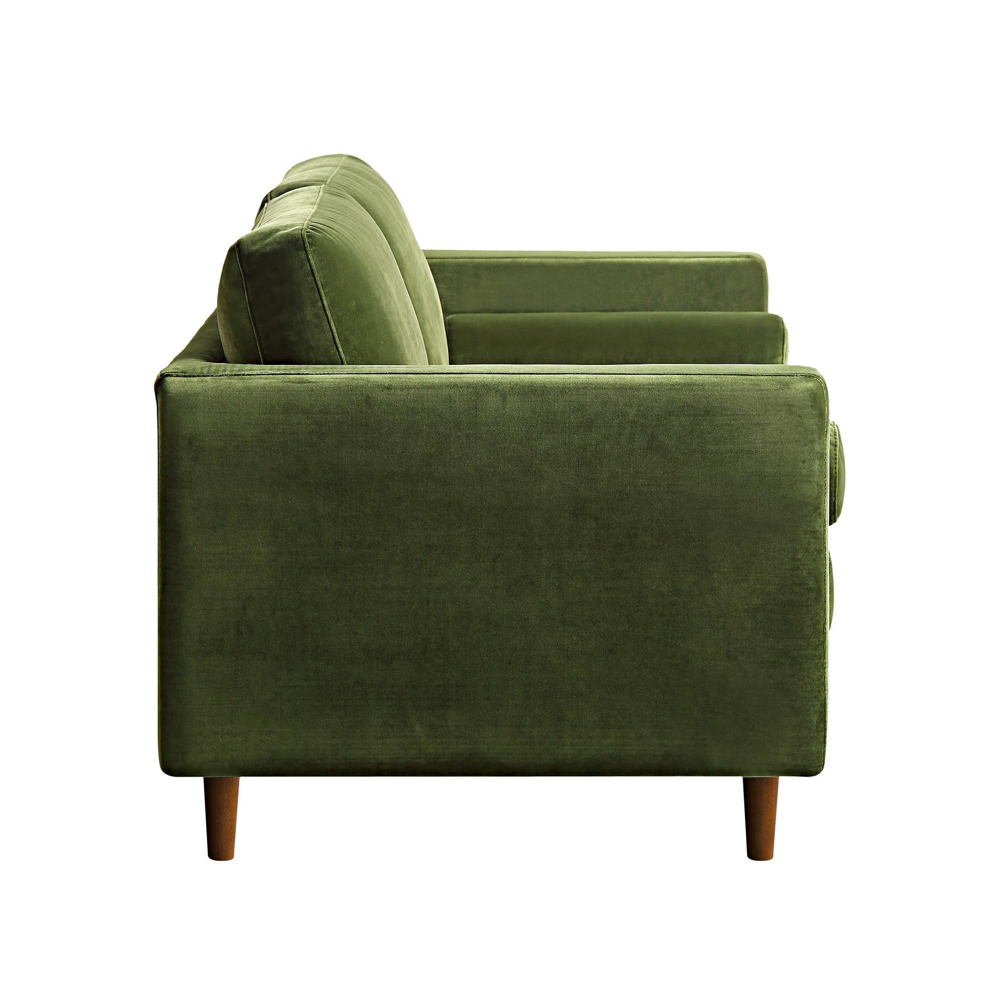 - Upholstered with earthy moss green velvet touch fabric, paired with solid wood legs with walnut colour stained finish.