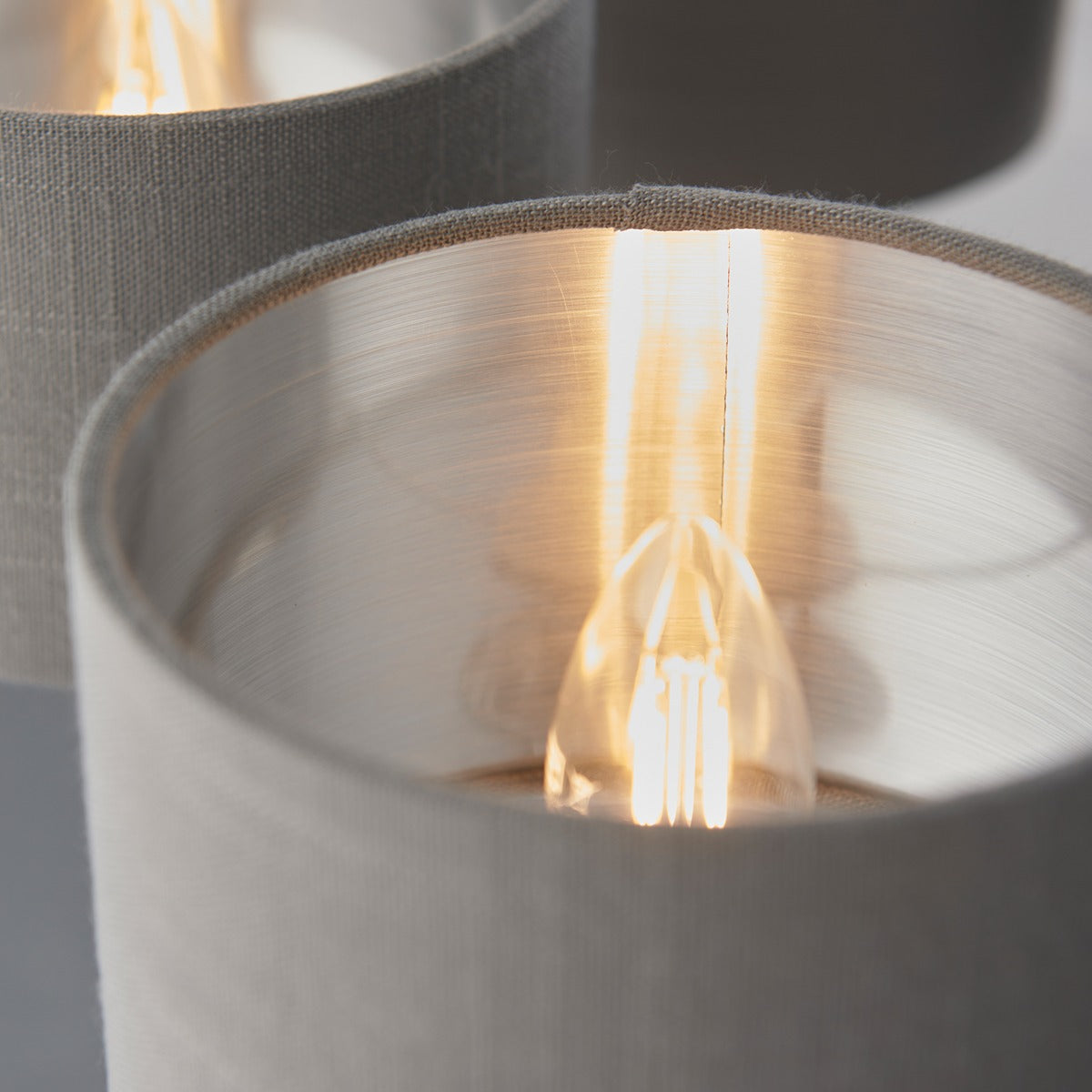 This multi arm pendant is a sophisticated combination of charcoal linen mix fabric shades with a reflective brushed metallic inner and bright nickel metalwork. This statement light is the perfect timeless addition to modern and classic homes of today.