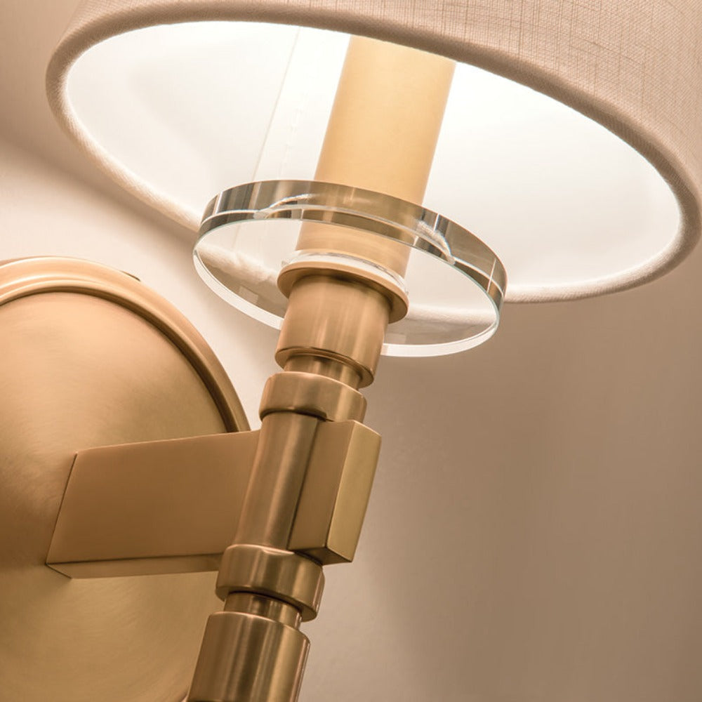 A beautiful mixture of materials enhances everyday interiors with our Blixen family. An off-white linen shade rests atop a long-tail crystal arm.