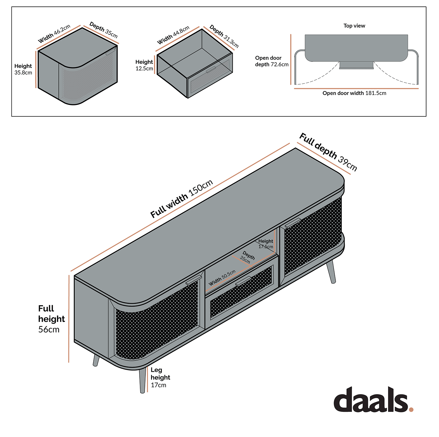 - Size: W 150 x D 39 x H 56 cm. The size of TV in product image is 50 inch.