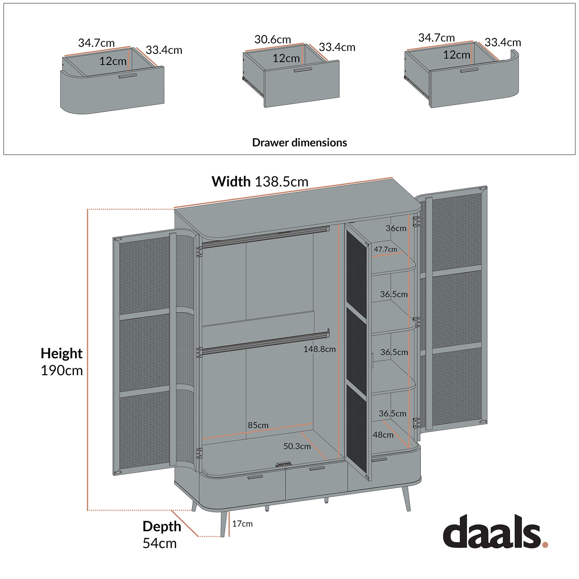 - Thoughtfully designed for modern living, it features a full double-width hanging space with two rails, ideal for organising garments of all lengths, alongside a shelving unit perfect for folded clothes, accessories, or shoes.