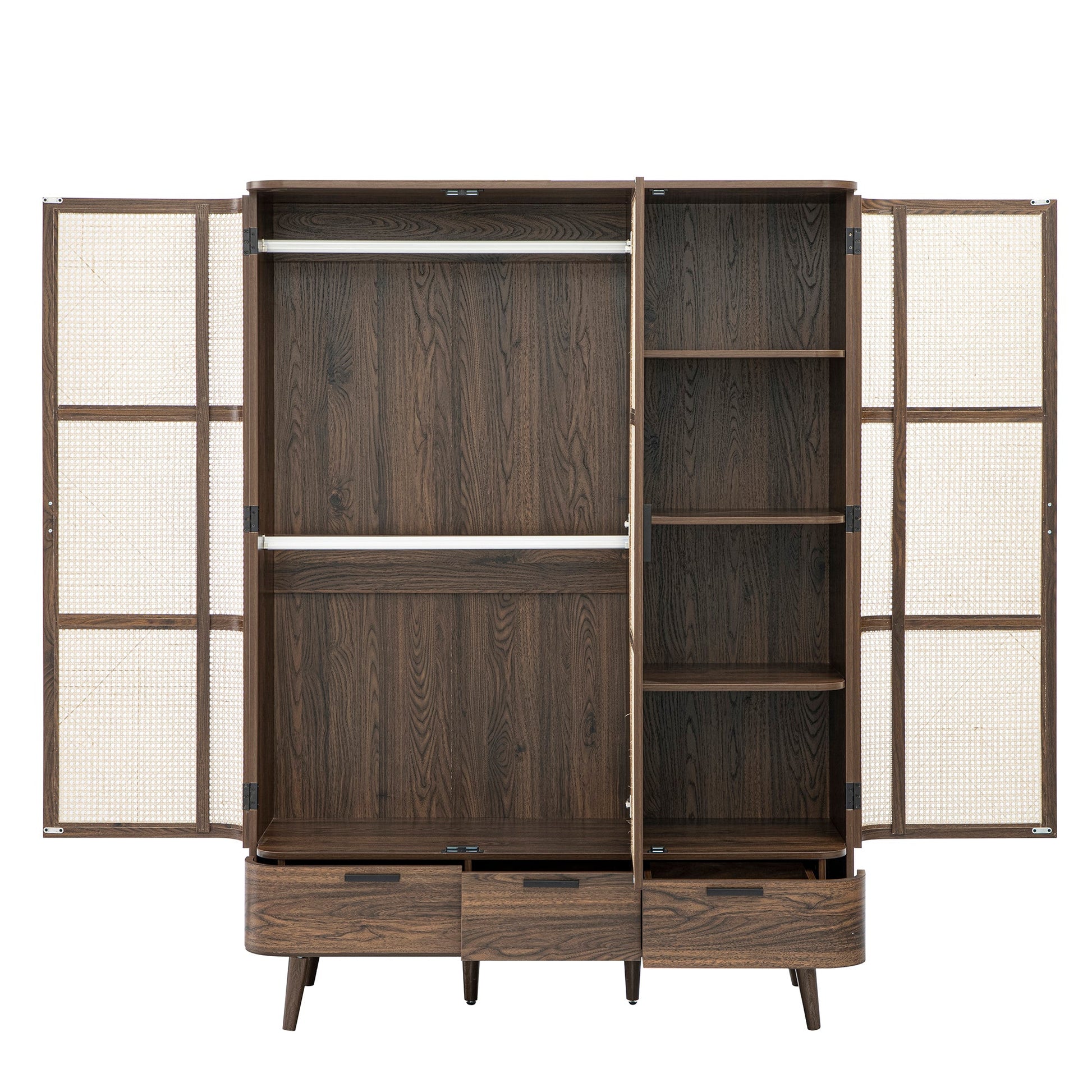 - Generous storage meets timeless elegance in the Izzy Curved Rattan Triple Wardrobe in Walnut.