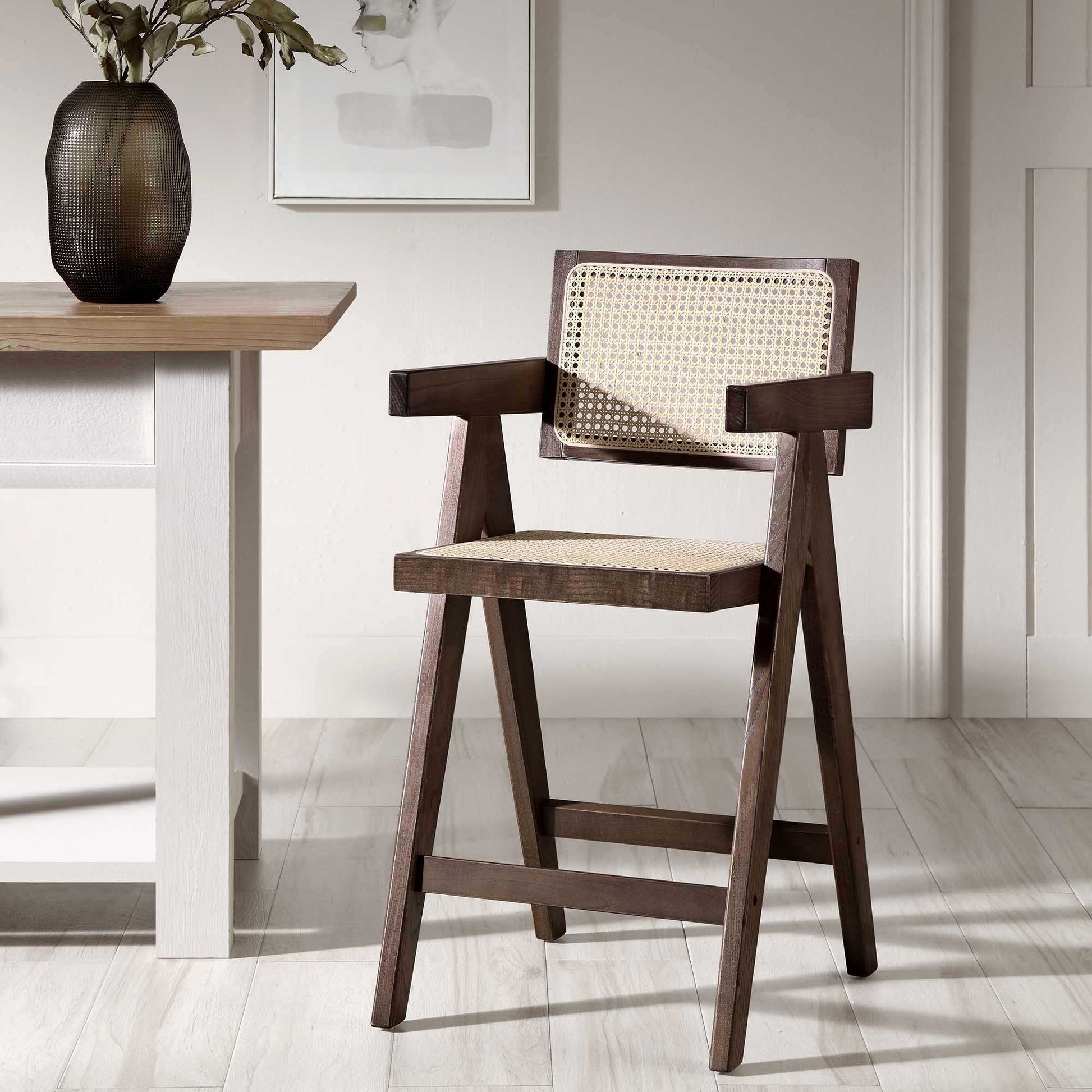 Jeanne Dark Walnut Cane Rattan Solid Beech Wood Counter Stool