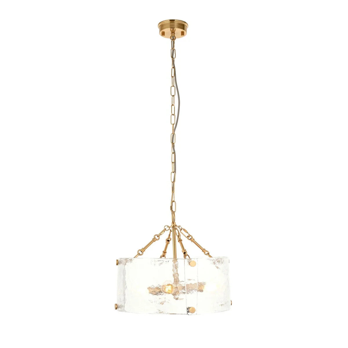 Sculptural and unique this 4-light pendant features a cylindrical shade formed from thick, handmade glass panels that showcase organic texture and artisanal character. The warm metallic frame and decorative fixings add a handmade touch, while the height-adjustable chain and grey braided fabric flex offer versatility in installation. Ideal for dining rooms, hallways, or living areas, it delivers a soft, ambient glow with a crafted presence.