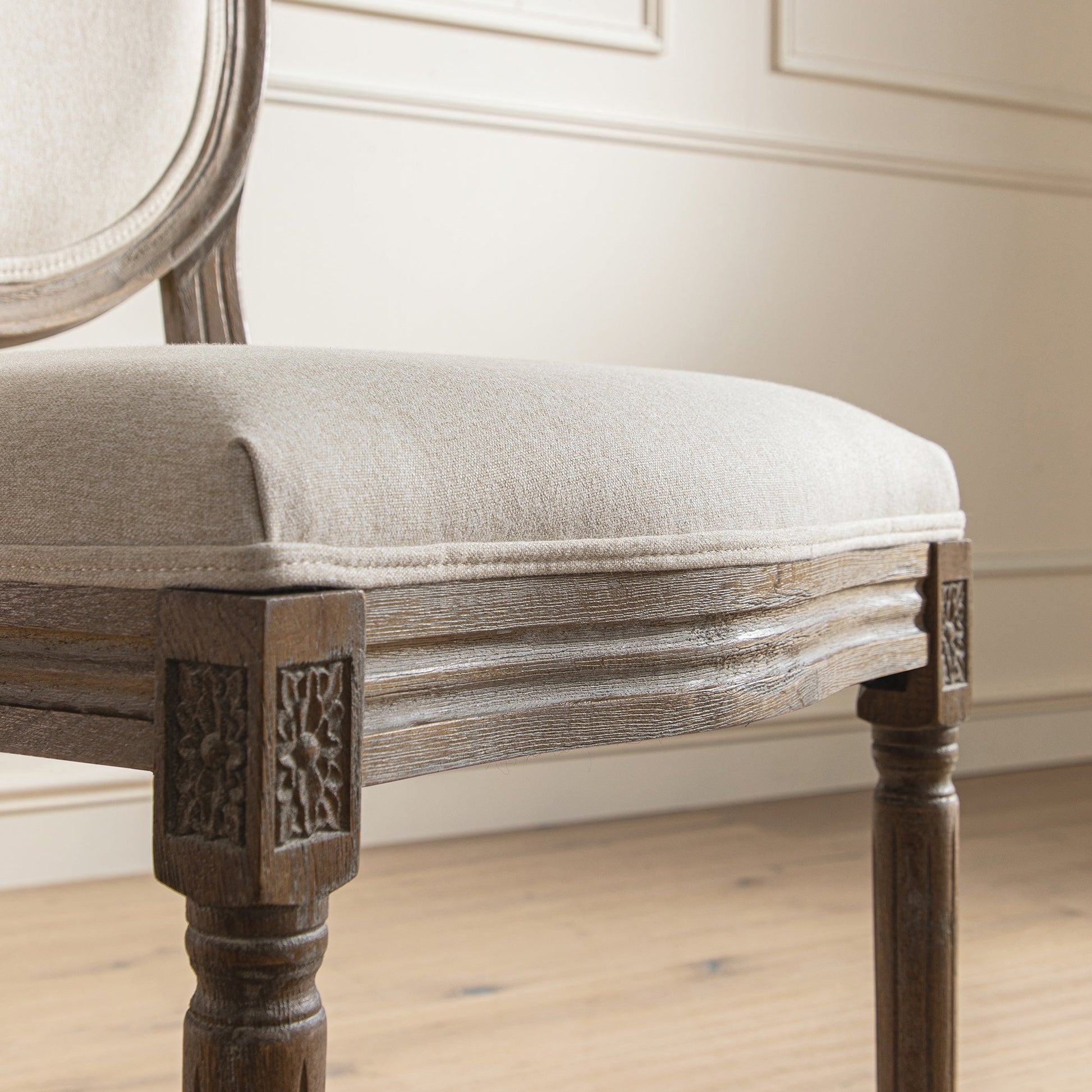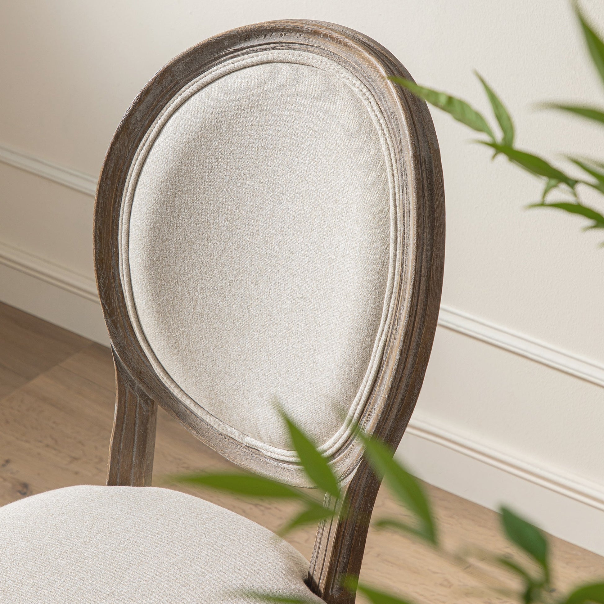 - Upholstered in a soft oatmeal brushed fabric and set in a beautifully weathered oak frame, they offer a refined yet relaxed aesthetic.