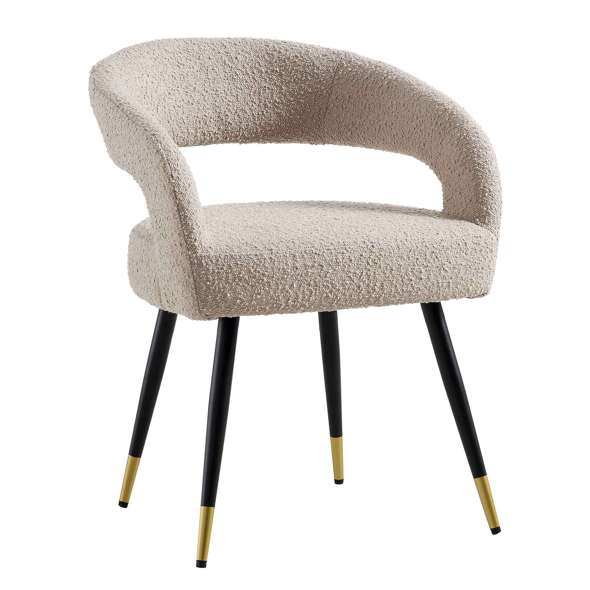 - Well-cushioned seat and luxe boucle upholstery in light taupe colour.