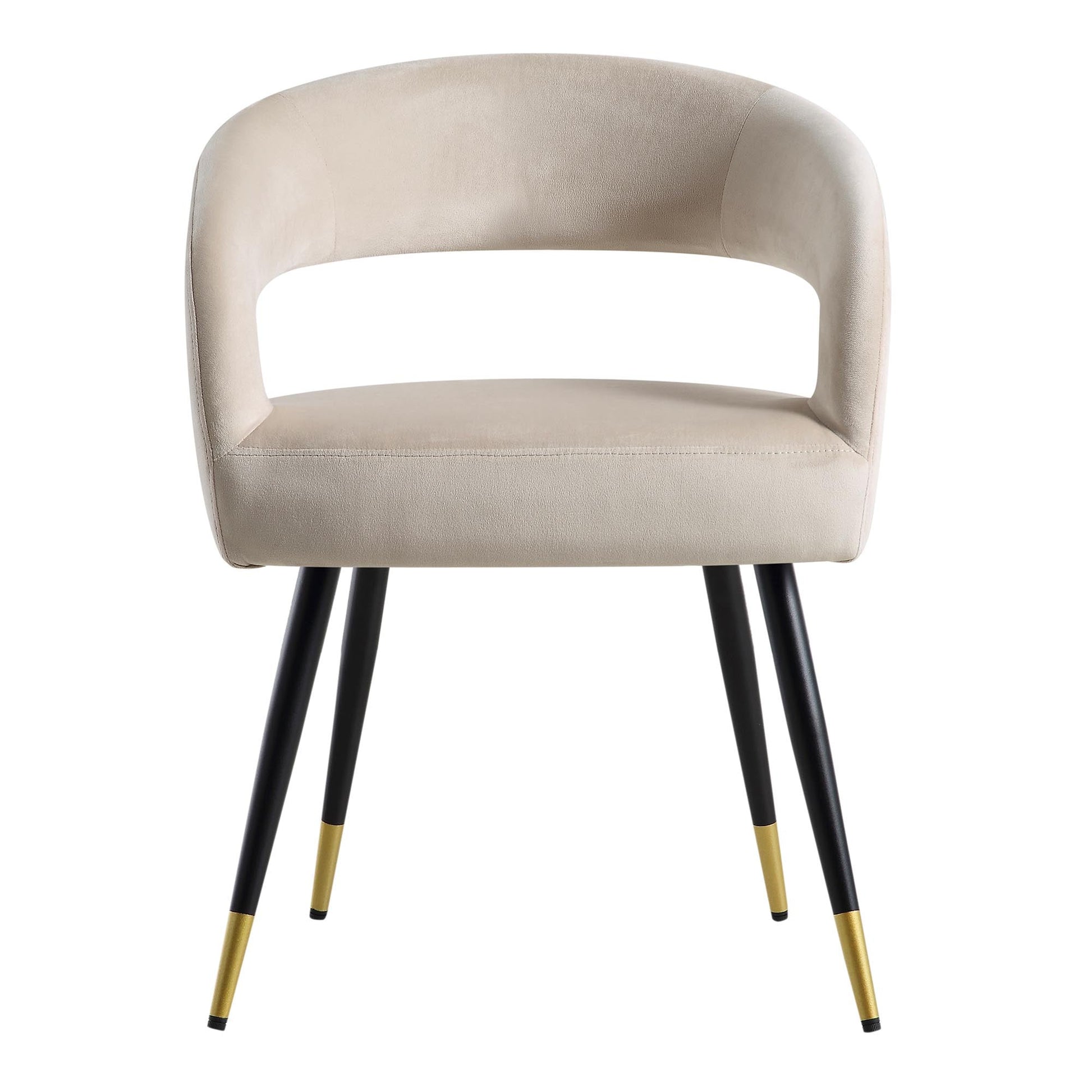 - The curved cut out backrest smoothly integrates into arms and the seat, paired with slight tapered legs with golden tip for an elegant look.
