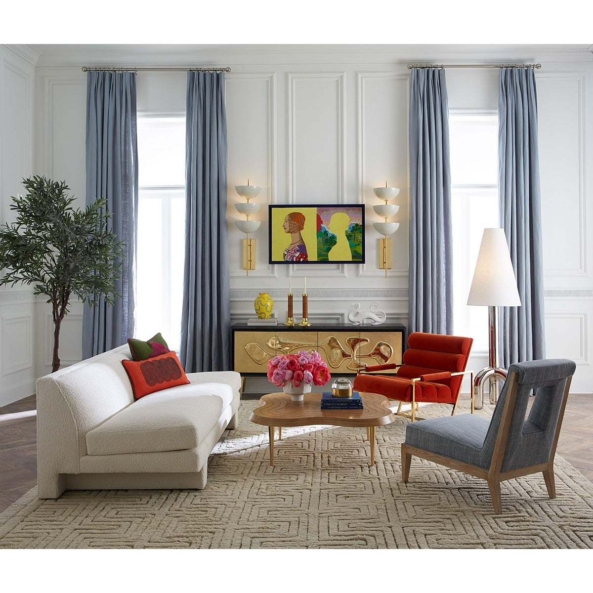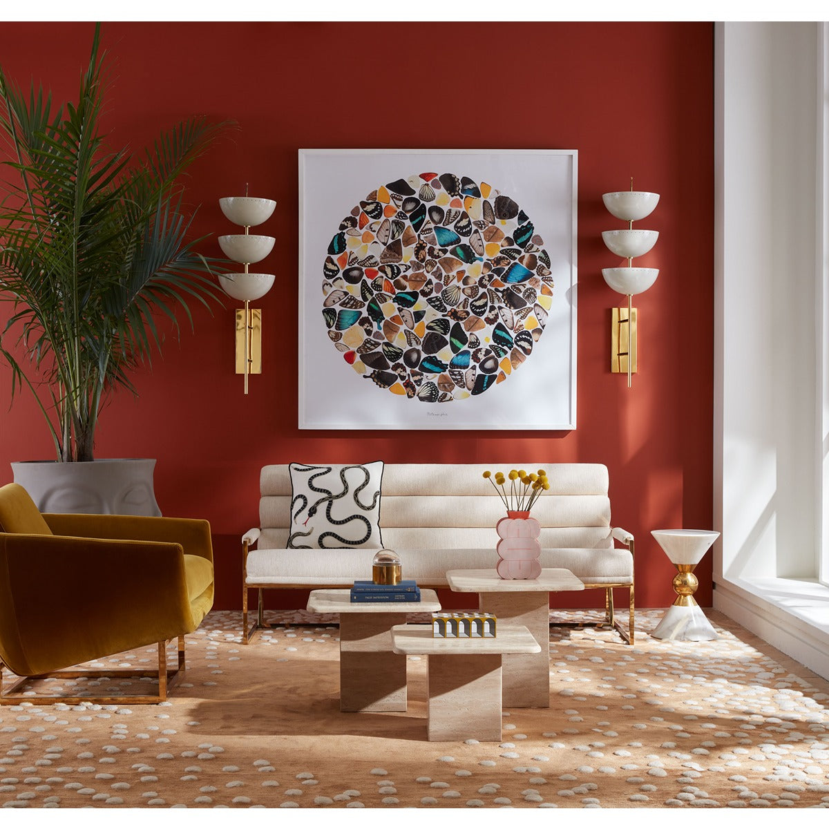 Large and in charge, our Lisbon Sconce is a glamorous gesture that's just as elegant in a studio apartment as it is in an Italian palazzo. A polished brass stem supports three half spheres of ivory enameled metal with subtle round perforations. With a soft ivory tone and gentle uplight, the Lisbon sconce balances strong presence with quiet glamour.