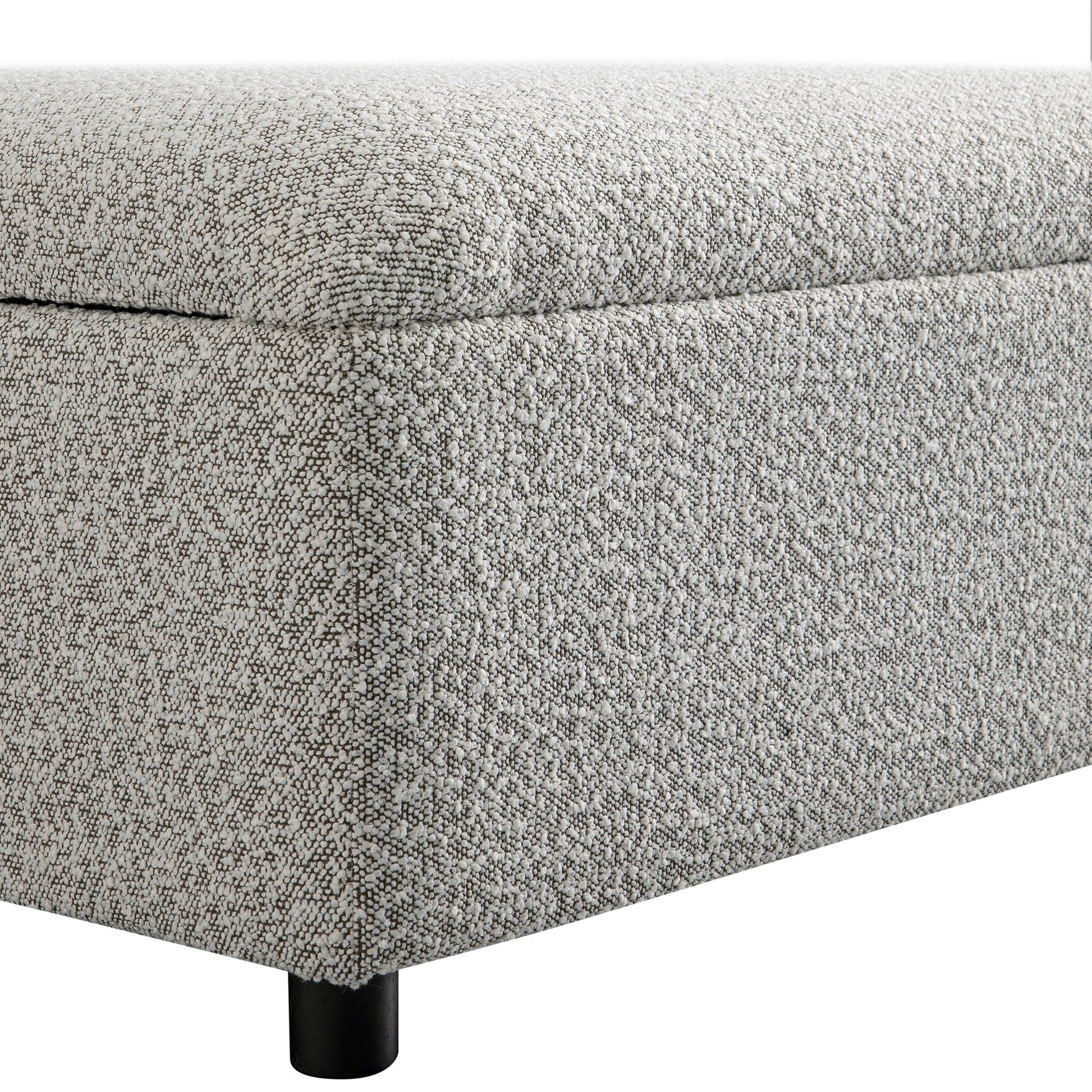 - Designed with ease and elegance in mind, the compact silhouette doubles as a chic ottoman by day, upholstered in a cosy grey boucle fabric that adds texture and warmth to any room.