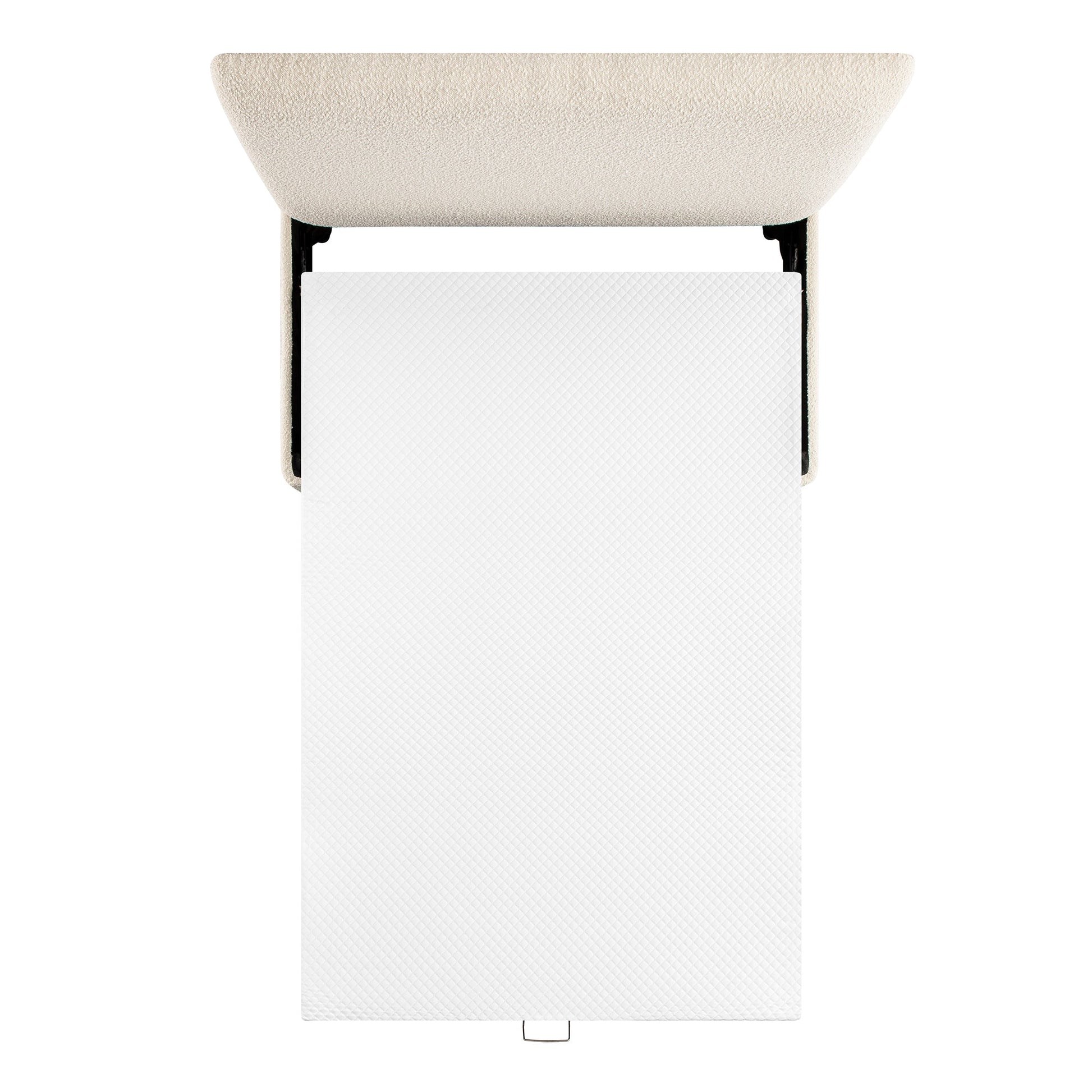 - Designed with ease and elegance in mind, the compact silhouette doubles as a chic ottoman by day, upholstered in a cosy beige boucle fabric that adds texture and warmth to any room.