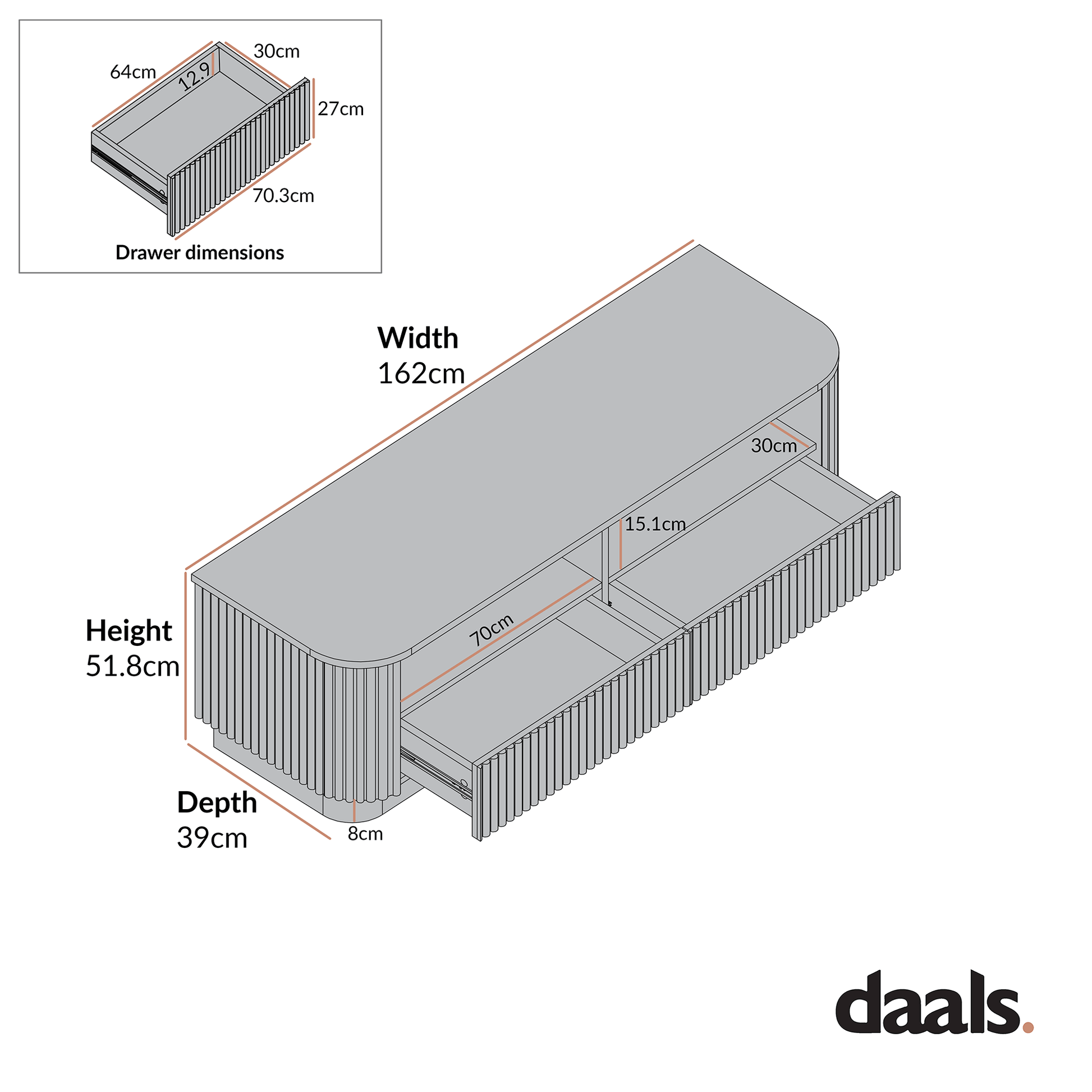 - At 162cm wide, it is perfectly proportioned for medium to large televisions and works just as well as a low sideboard in calming, contemporary spaces.