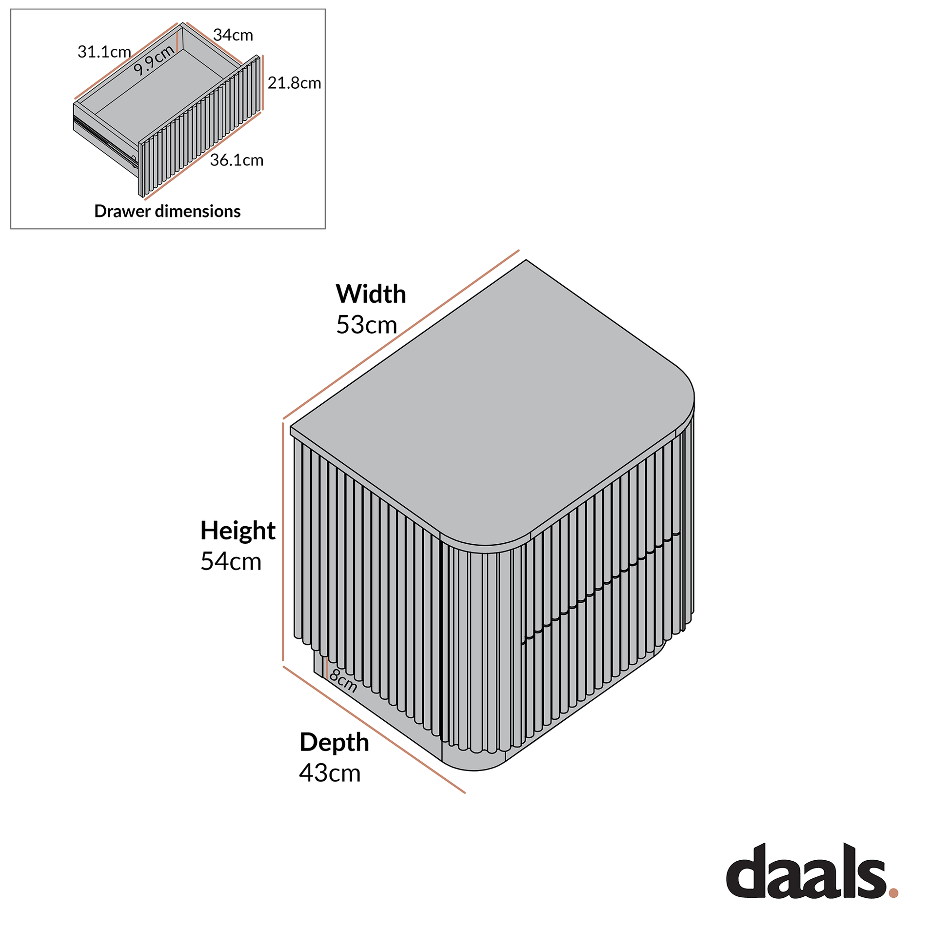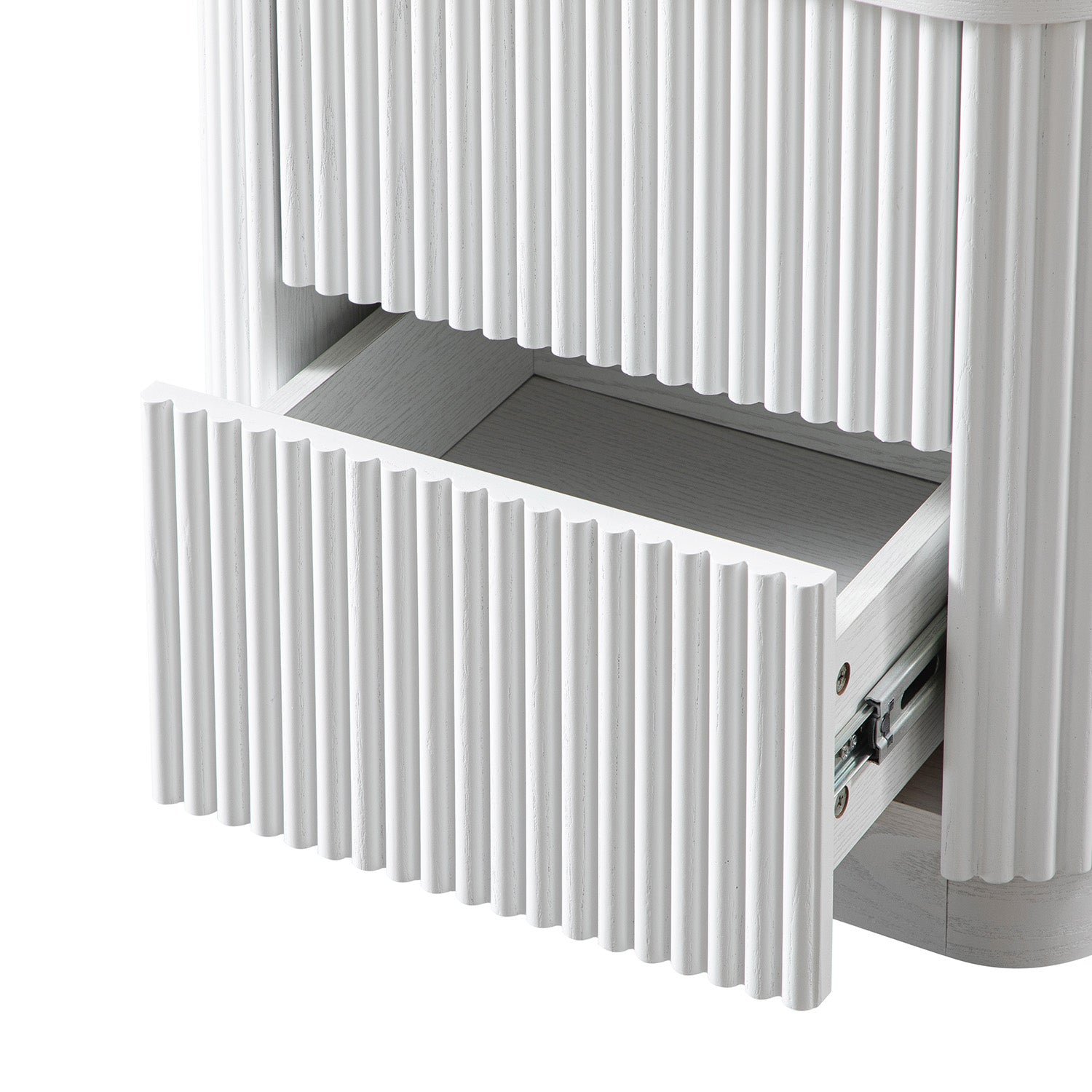 - The bedside table features all solid ash flutes on 3 vertical surfaces, including the front and both sides, for a striking and balanced look.