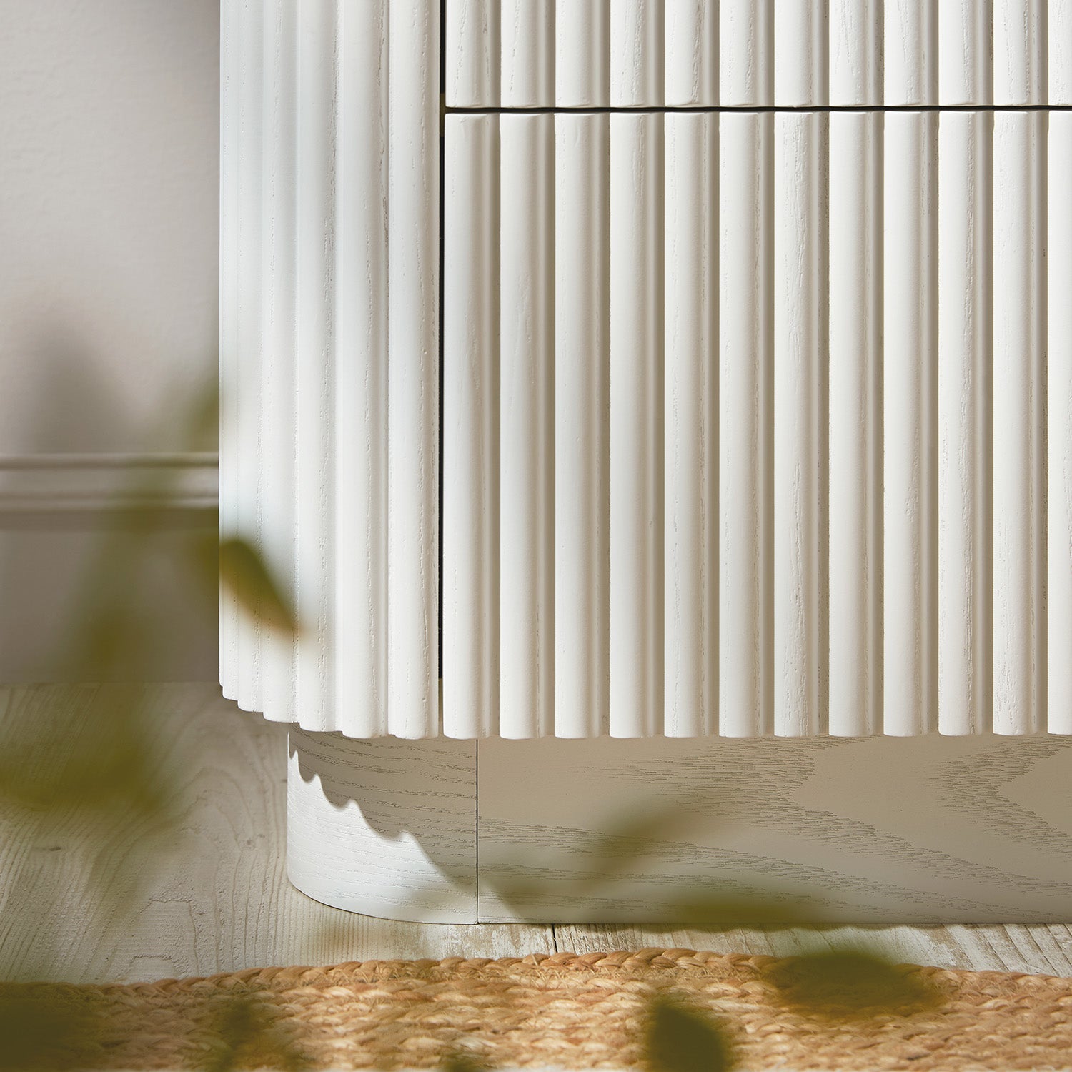 - The rounded silhouette and vertical fluting offer quiet drama, while the pale tone brings lightness and clarity to your bedroom space.