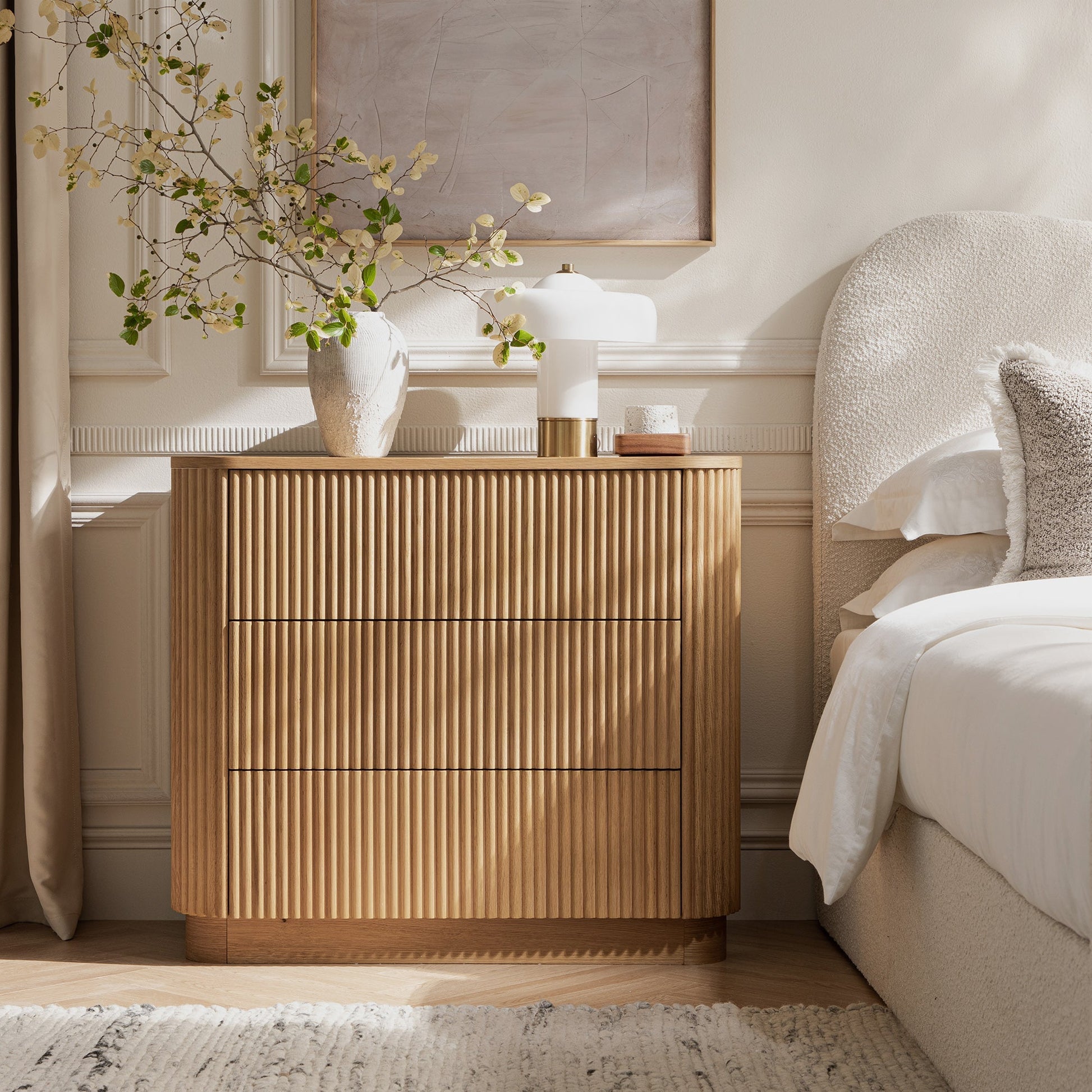 - Complete the look: Pictured with the Maru Oak Chest of 3 Drawers is our Egerie Curved Headboard Beige Boucle Ottoman TV Bed, Indra Light Grey Handwoven Wool Rug, Esmeralda White Floral Embroidered Linen Blend Duvet Set and Kyra Stone Bouclé Fringed Cushion.