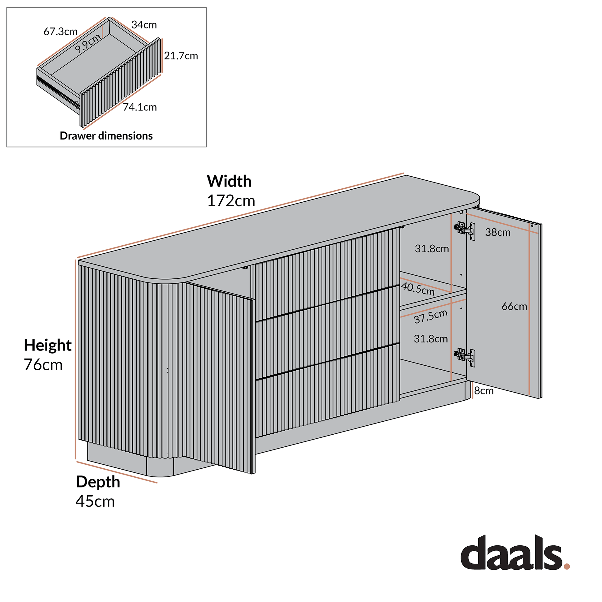 - The central trio of drawers offers practical organisation for cutlery, linens, while two side cupboards with height-adjustable shelves offer more storage space.