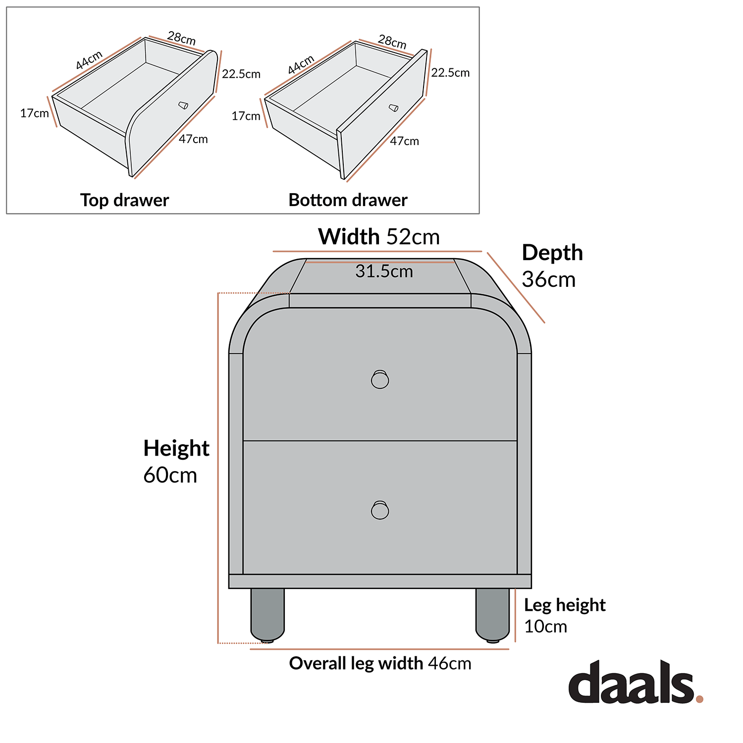 - Complete the look: Pictured with our Maude 2 Drawer Bedside Table is our Egerie Curved Headboard Ottoman Bed in Slate Blue Striped, and our Aurora Hand Braided Cream Jute Rug.