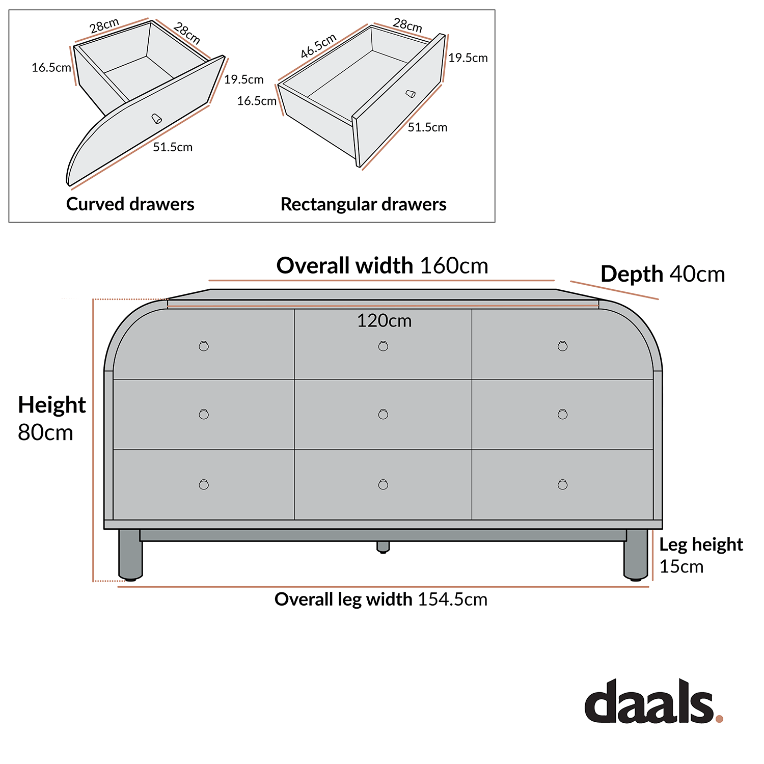 - Top left and right drawer internal storage space: W 28.0 x D 28.0 x H 16.5 cm