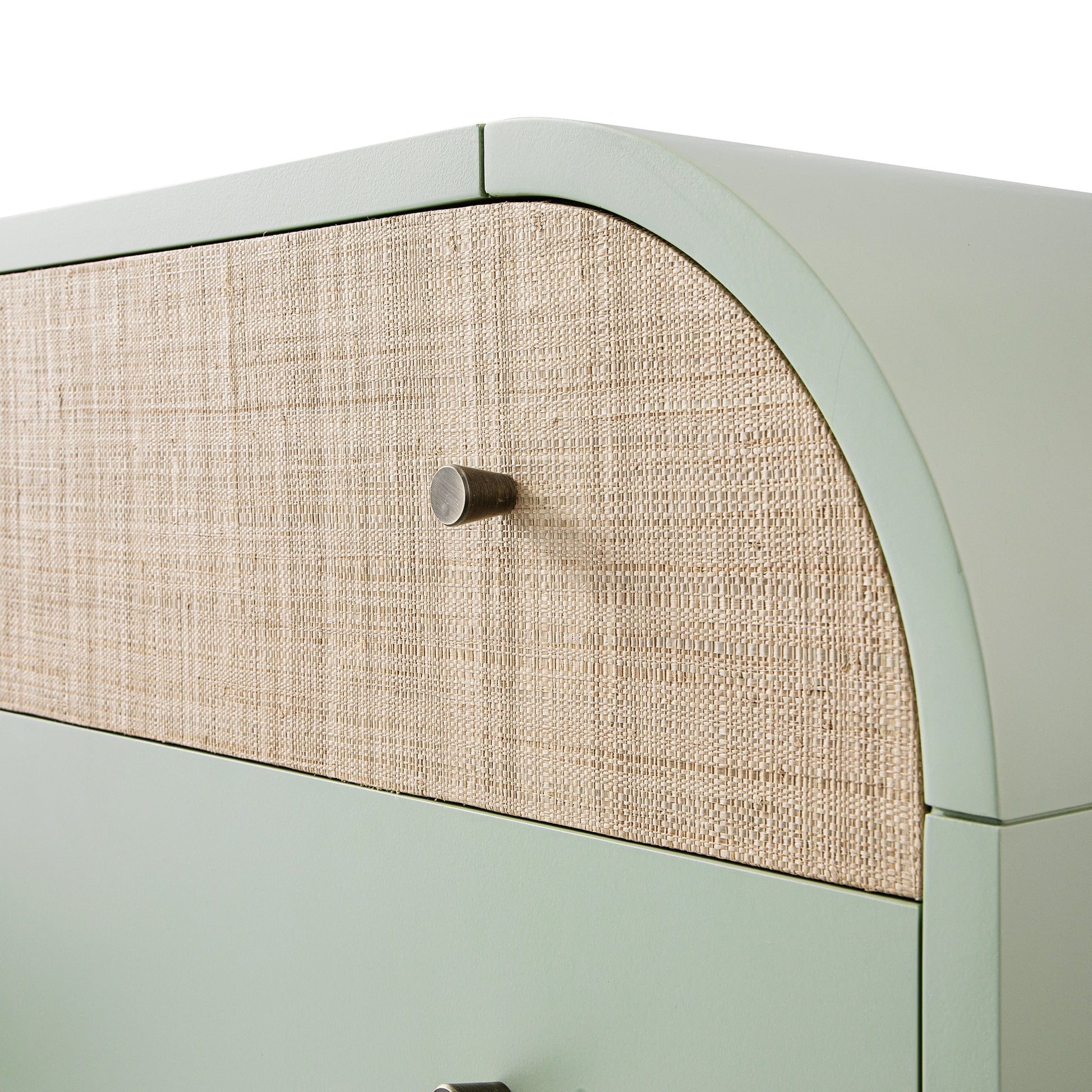 - Its rounded silhouette, gentle green matte painted finish, and textural raffia-topped drawers create a harmonious blend of retro charm and contemporary ease.