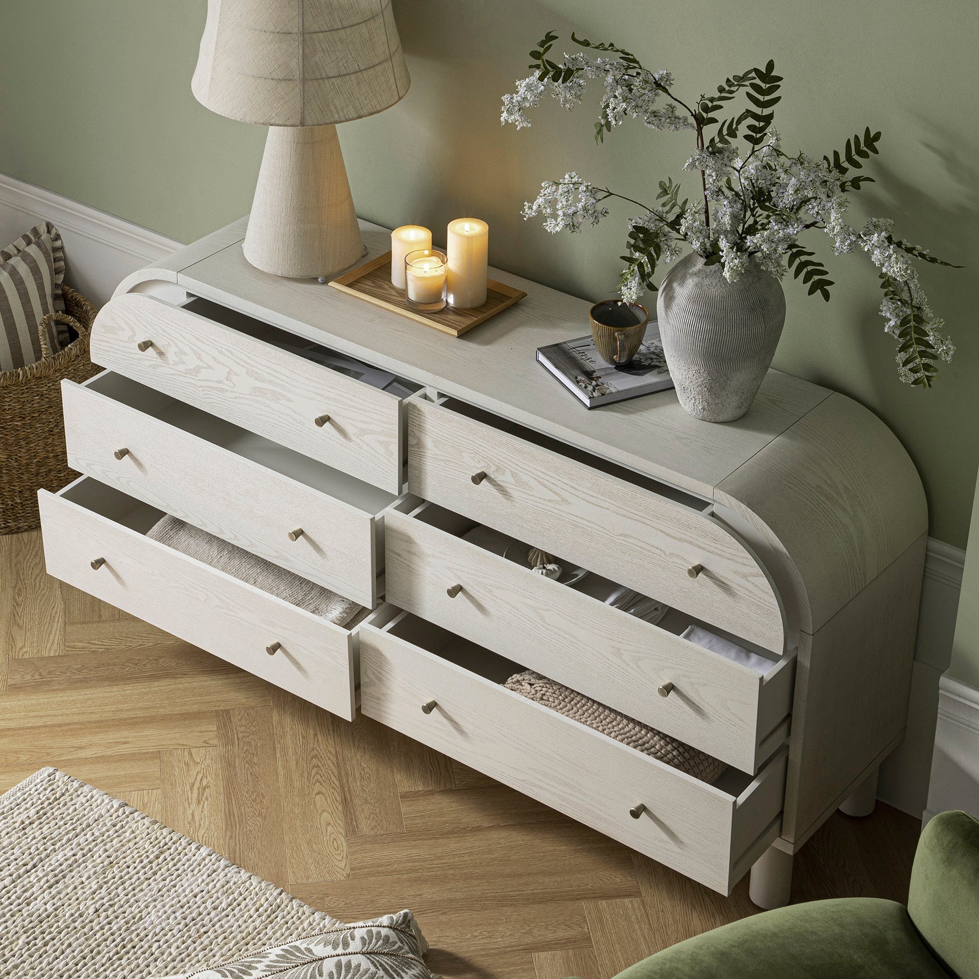 - Complete the look: Pictured with our Maude Chest of 6 Drawers is our Vine Collection Japonica Hand Embroidered Cushion, Aurora Hand Braided Cream Jute Rug, Calliope Skirted Armchair in Fern Green Velvet , and our Edith Reversible Linen Blend Sage Green Striped Frill Cushion.