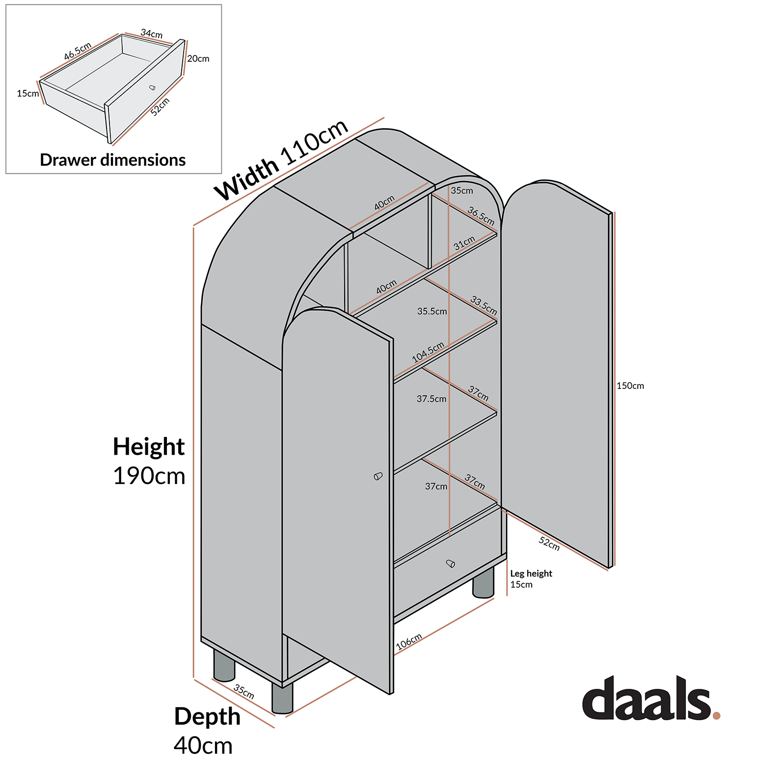 - Drawer internal storage space: W 46.5 x D 34.0 x H 15.0 cm