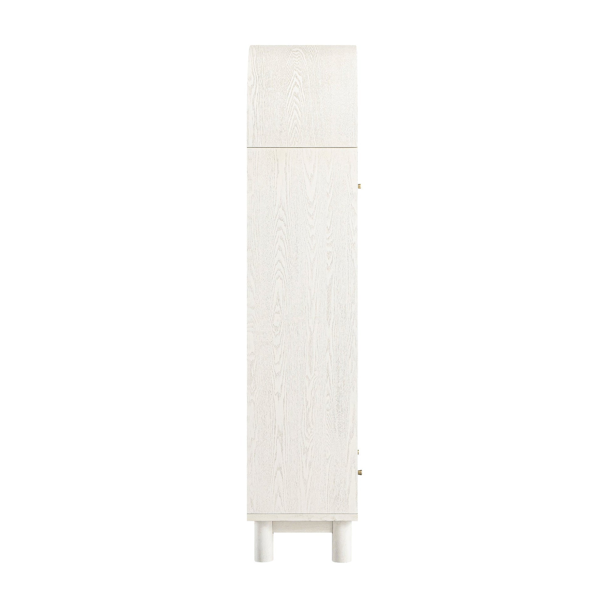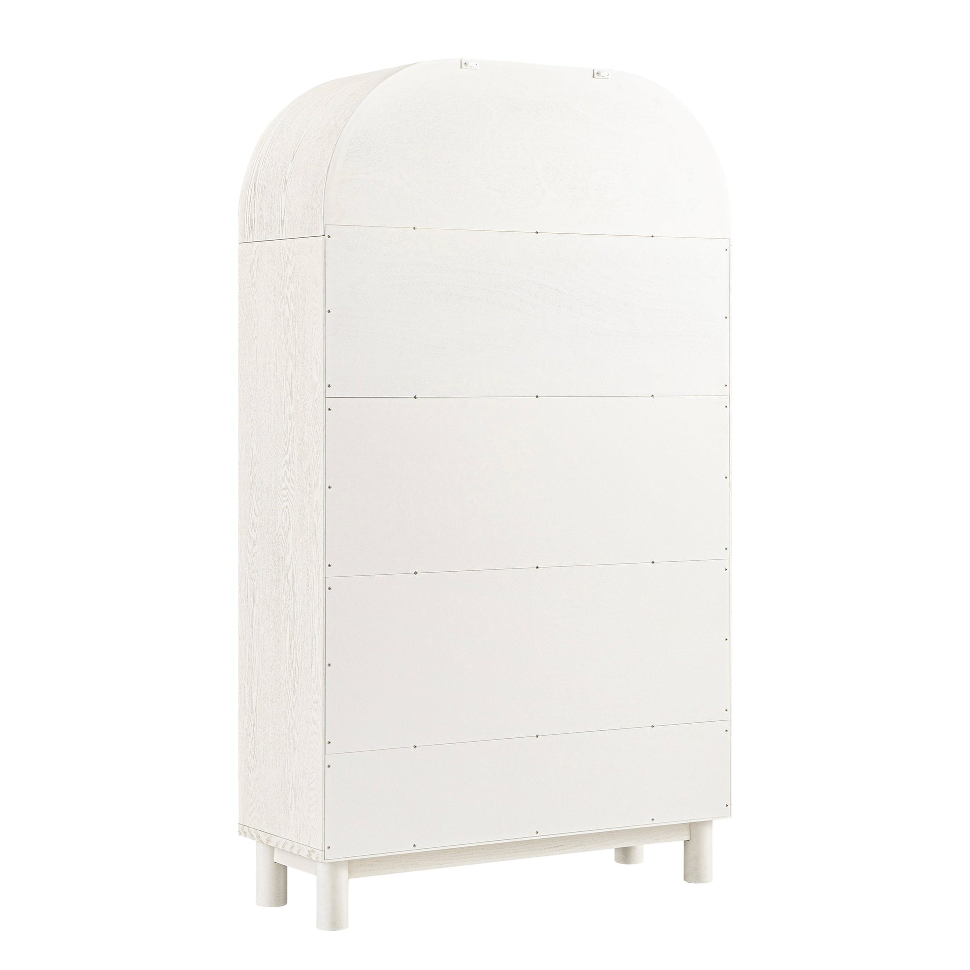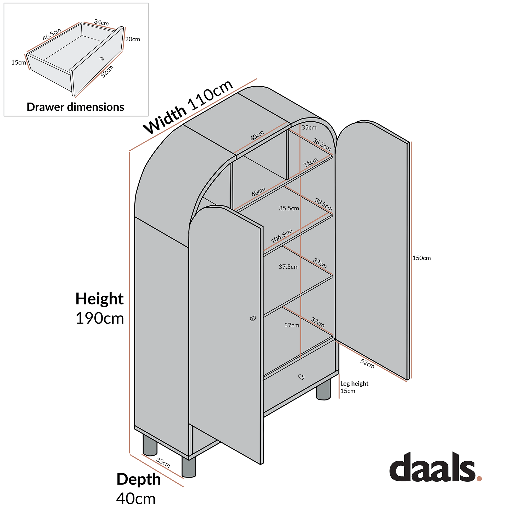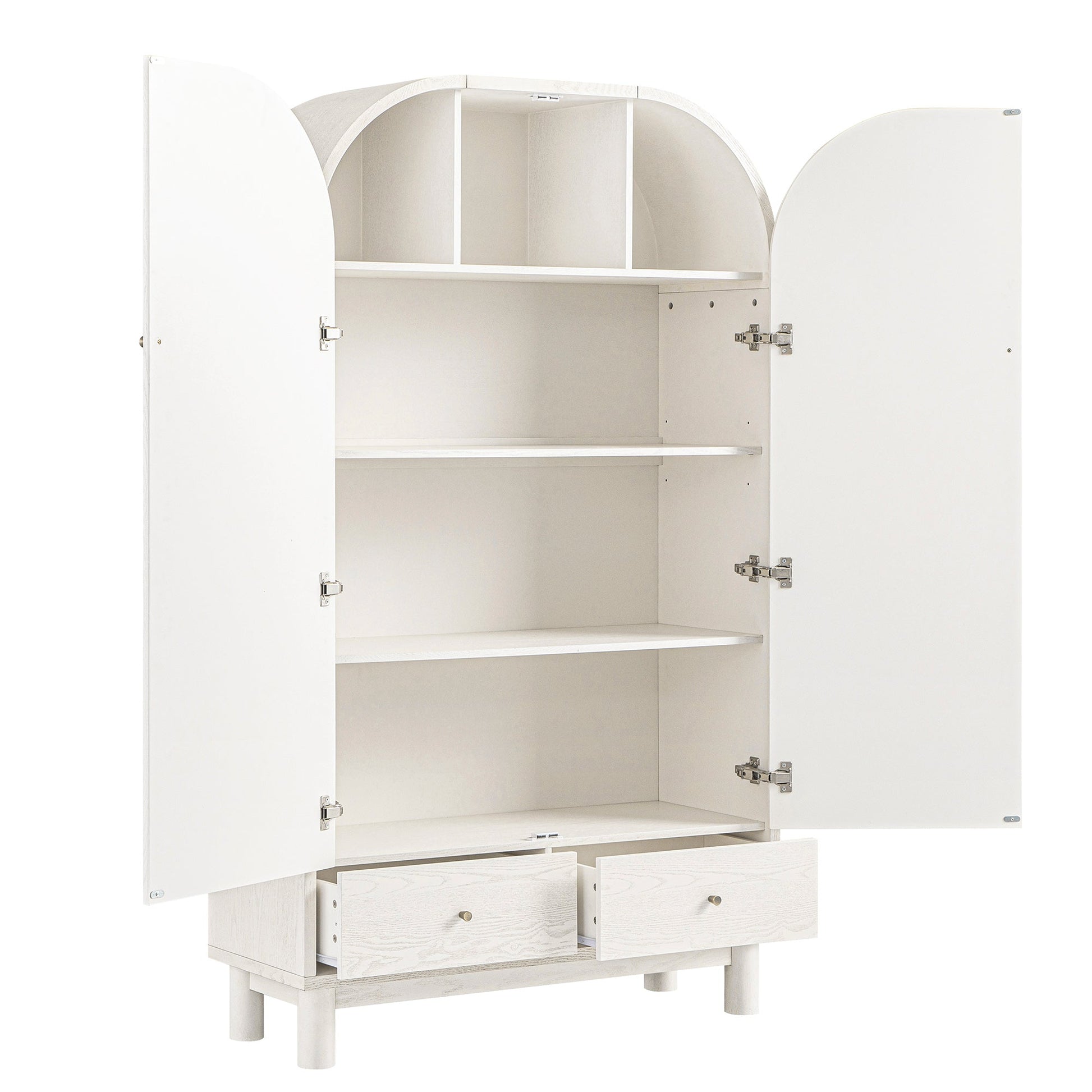 - Two arched cabinet doors open up to 4 shelves, on top of two bottom drawer, offering plenty of storage for all those tableware, barware, linens and other loose ends.