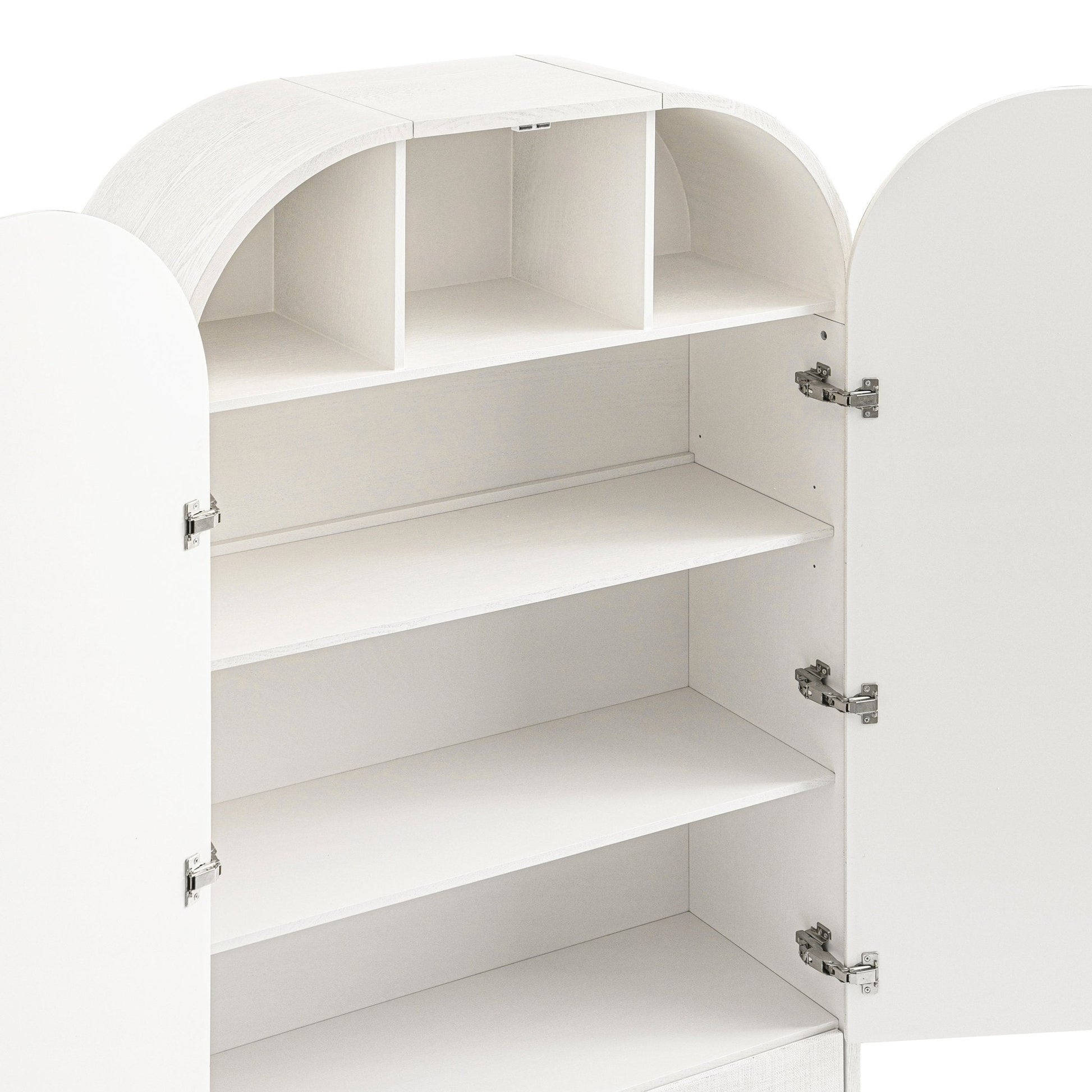 - Two arched cabinet doors open up to 4 shelves, on top of two bottom drawer, offering plenty of storage for all those tableware, barware, linens and other loose ends.