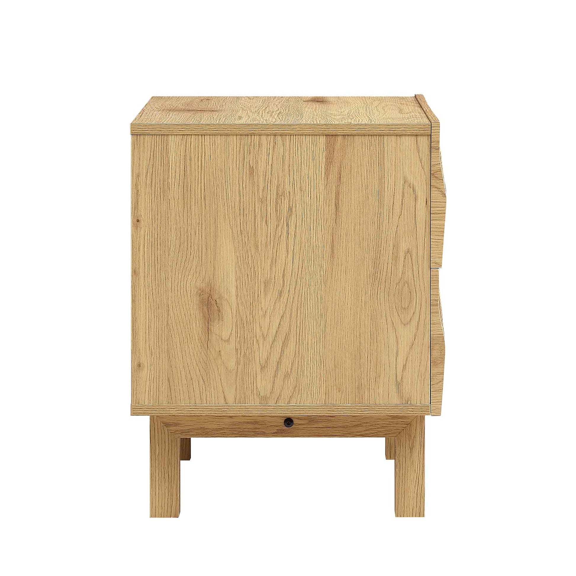 - The unique sculptural facade features flowing waves across the front of the bedside cabinet, cleverly concealing the drawer doors.
