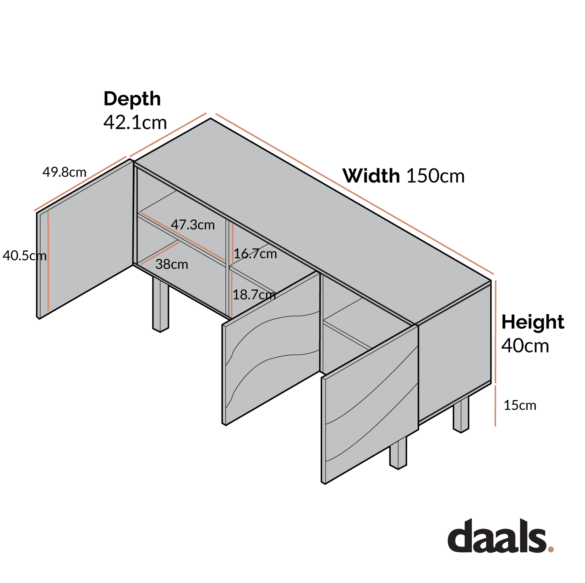 - The 150cm wide TV unit has 3 doors opening up to plenty of internal cupboard storage, with adjustable shelves for convenient storage and 3 apertures on the back for cable management.