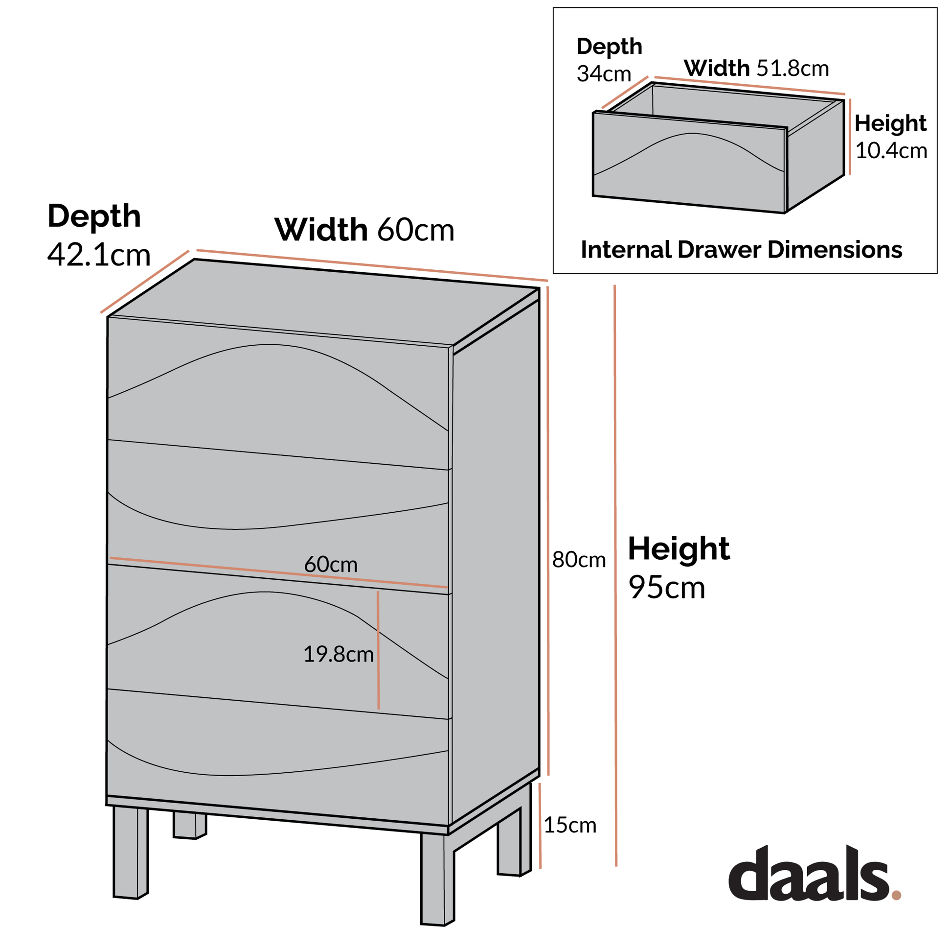 - The 95 cm tall cabinet offers 4 drawers on metal runners for plenty of storage space.