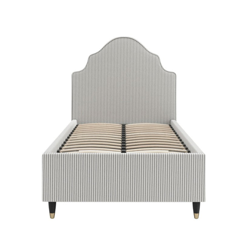 The Luis Grey Thin Stripe Single Bed features a classic spindled headboard and is upholstered in a soft cotton-blend fabric with subtle grey stripes. Combining comfort with timeless style, this bed adds a refined touch to any bedroom. Perfect for creating a cozy and stylish space.