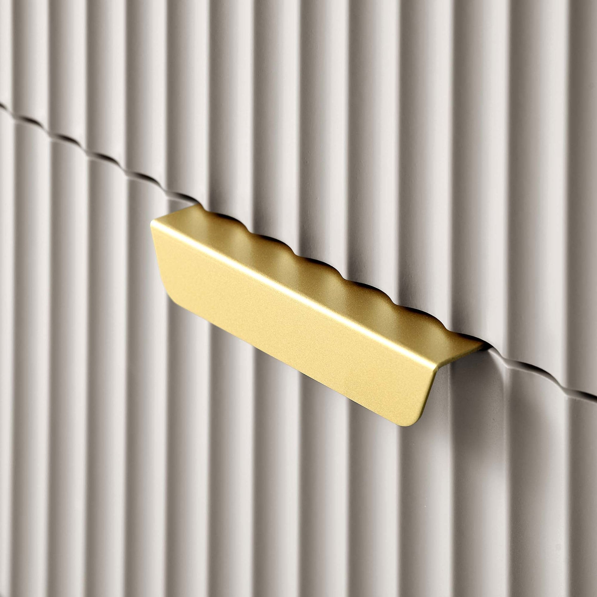 - The cabinet features a ridged surface on the doors and drawer fronts, finished in matte taupe paint