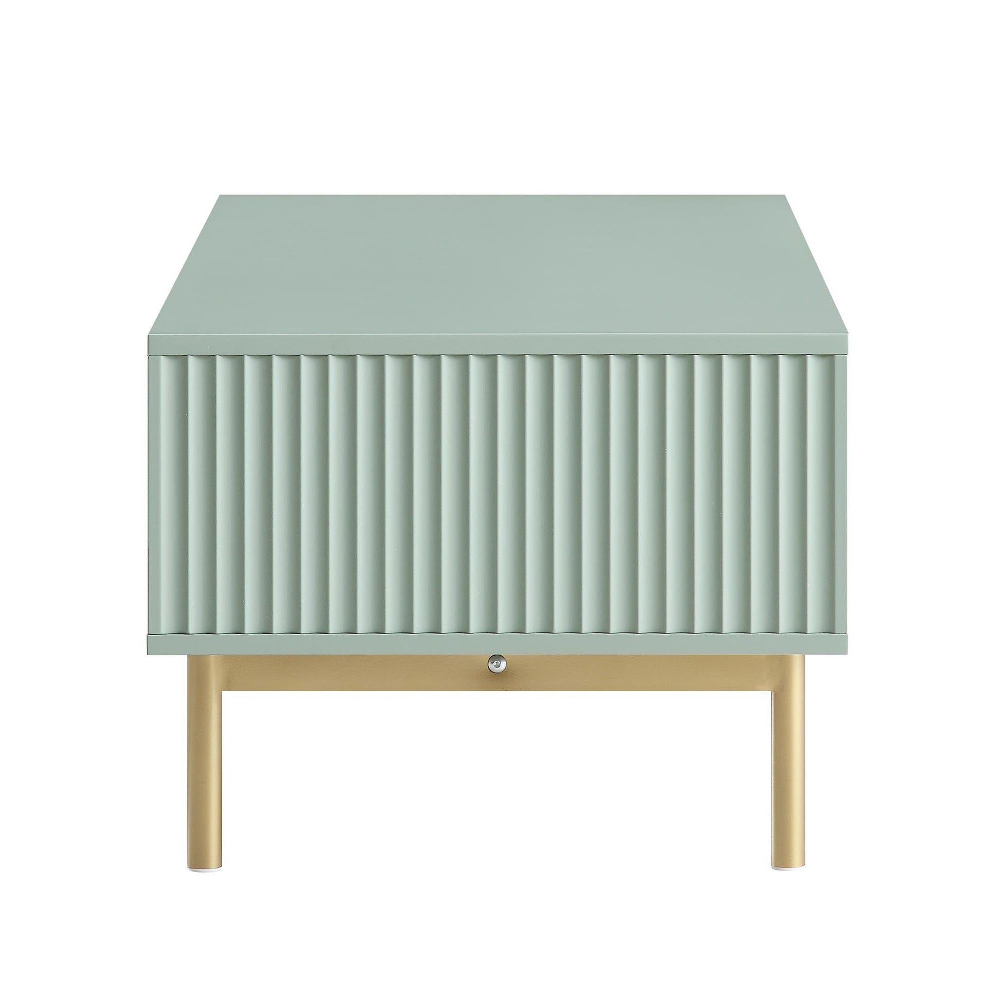 - With a ridged finished in matte sage green paint, the coffee table is further enhanced by the gold drawer handle and legs.