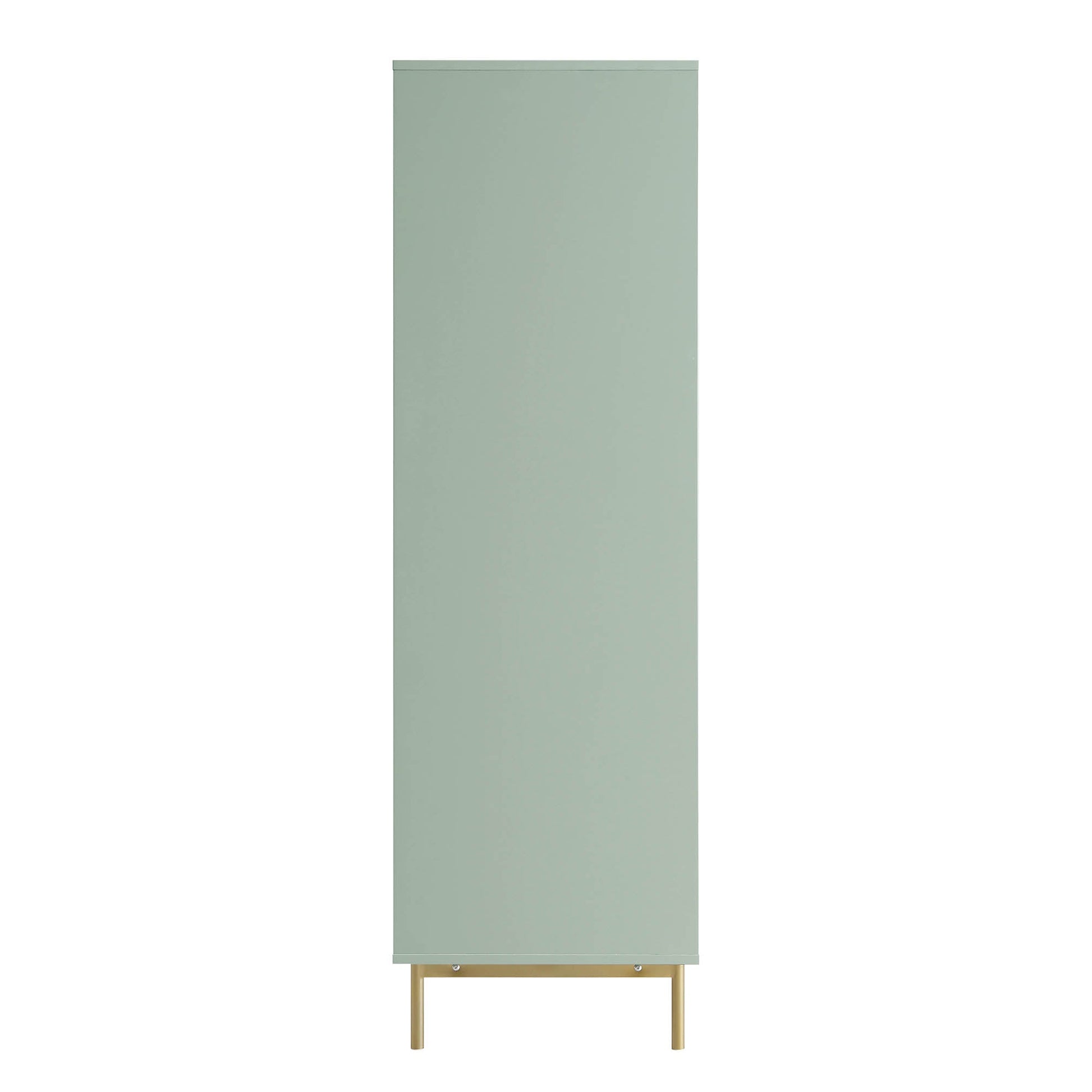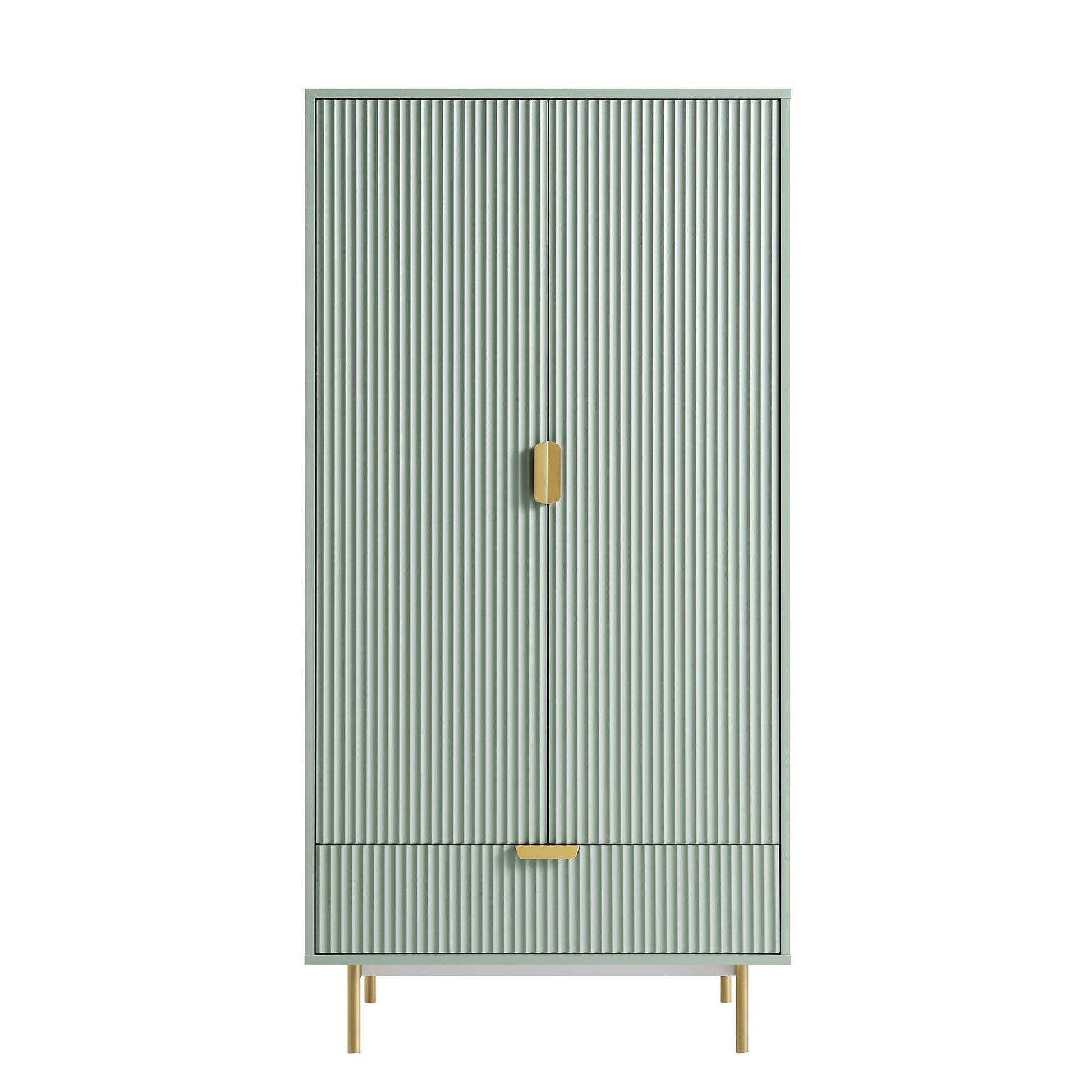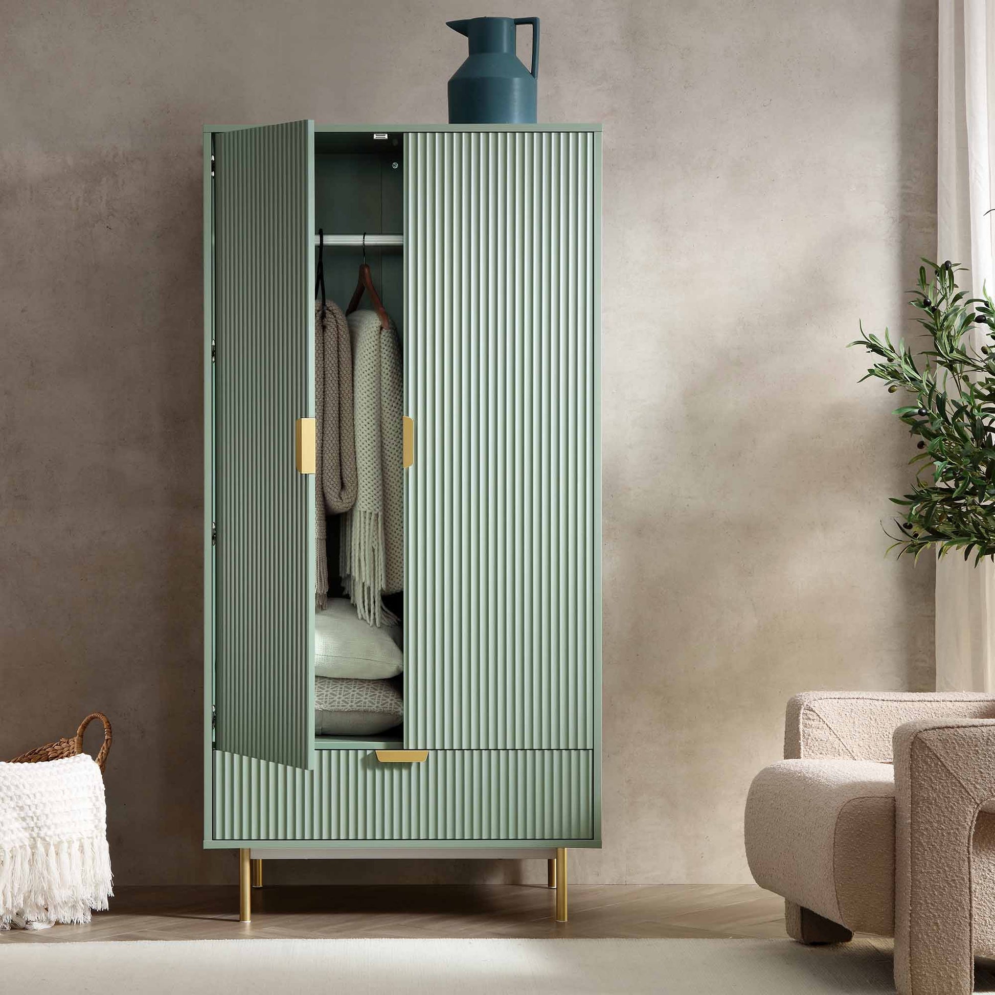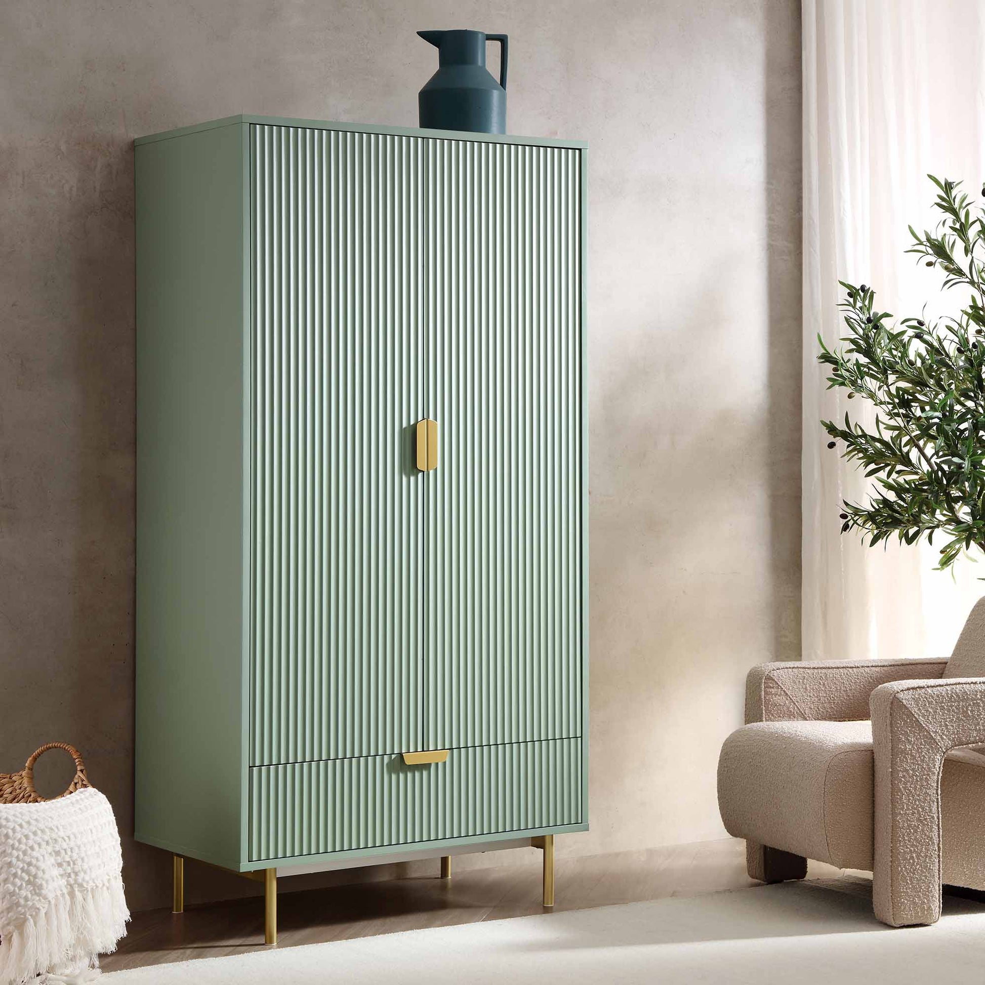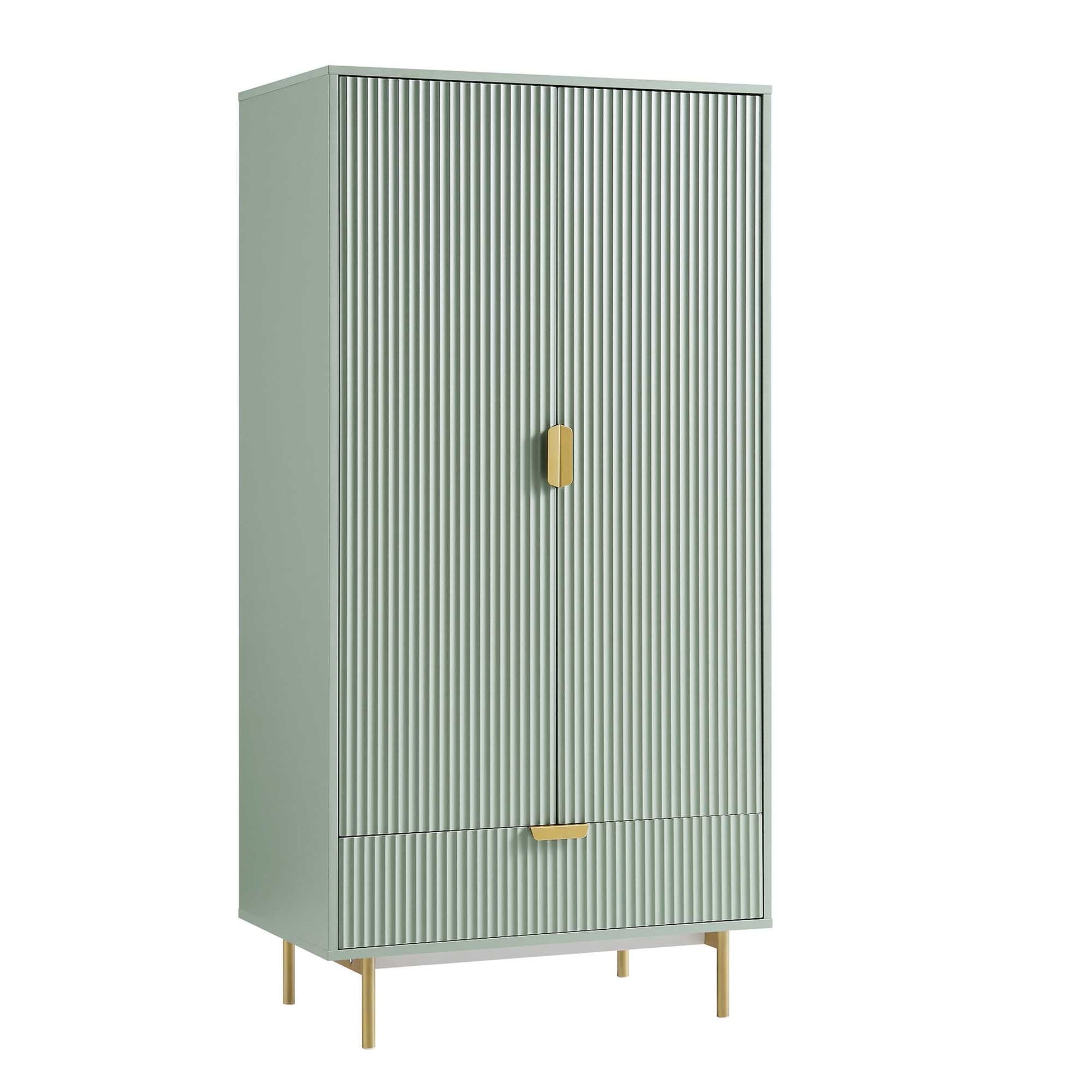 - The wardrobe features stylish ridged doors and drawer front finished in matte sage green paint, paired with gold handles and legs.