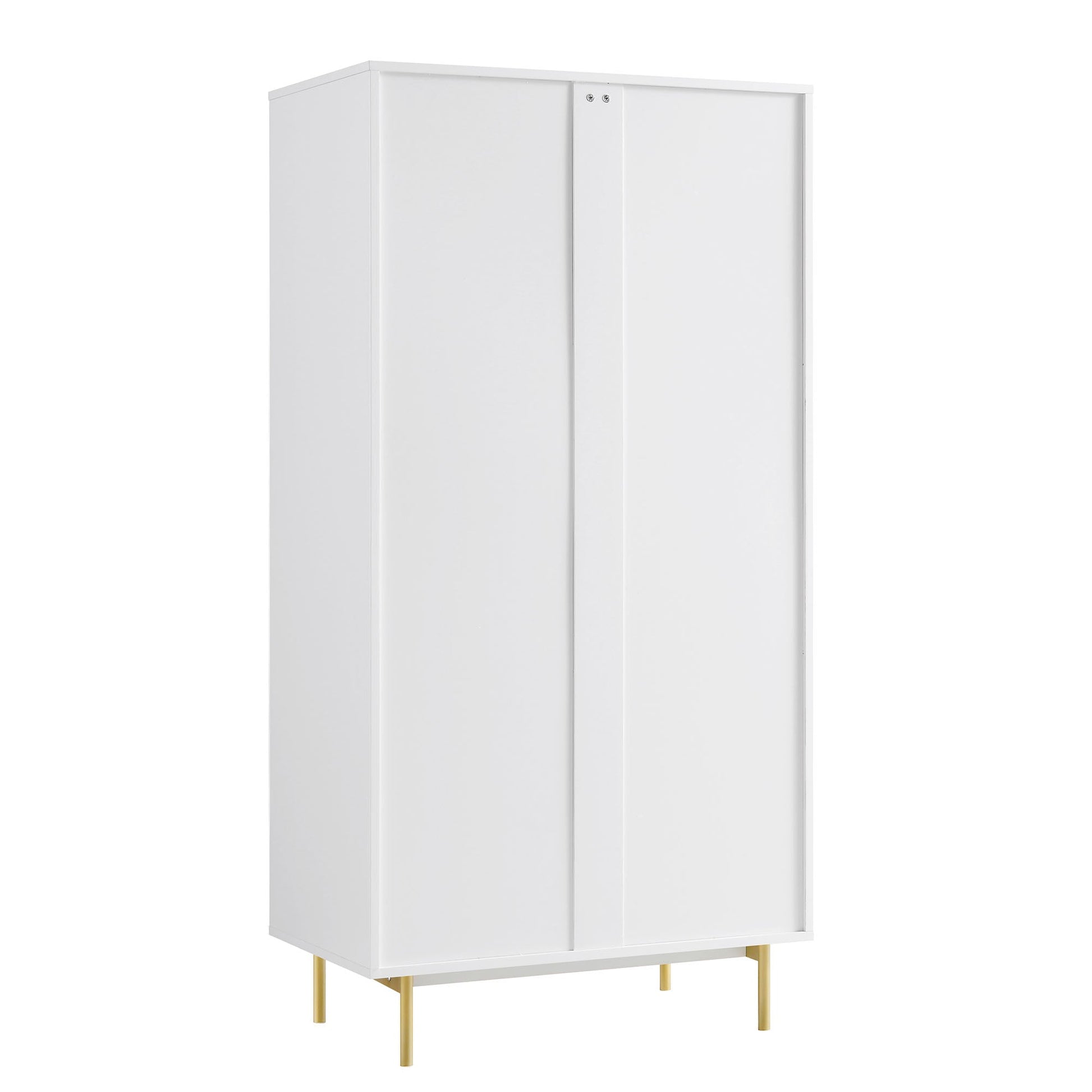 - The wardrobe features stylish ridged doors and drawer front finished in matte white paint, paired with gold handles and legs.