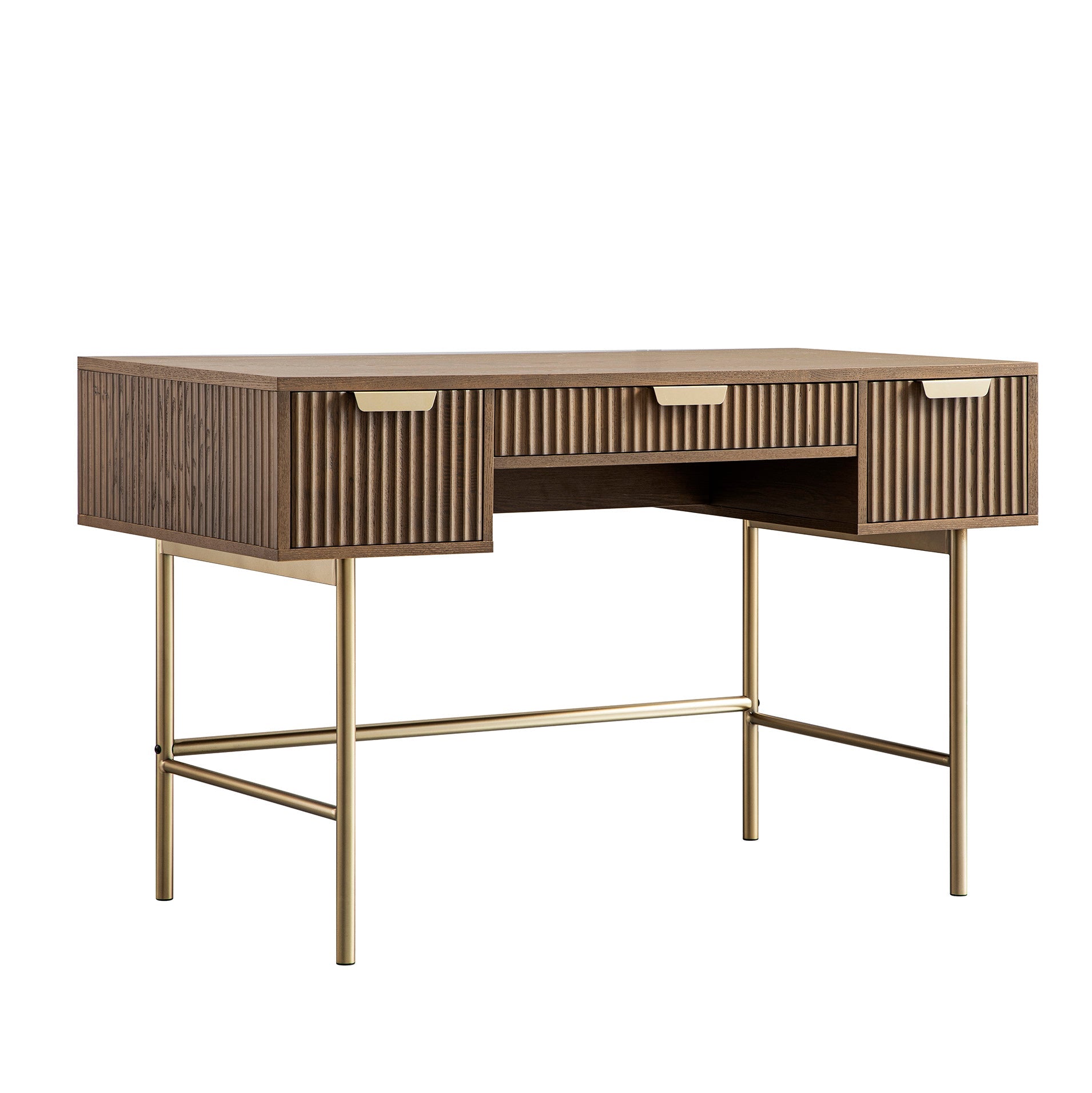 - The dressing table features 3 drawers with a ridged front finished in dark shaded stain, paired with gold handles and legs.