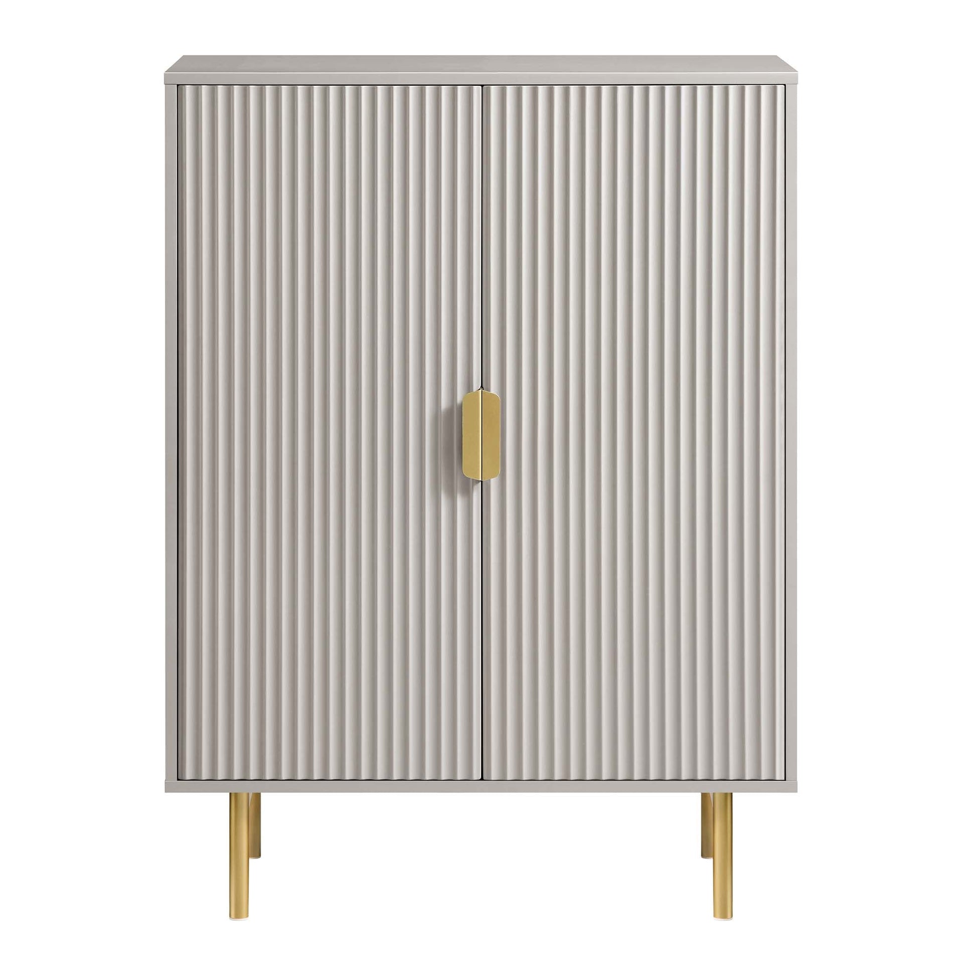 - The cabinet features ridged door surface finished in matte taupe paint, paired with gold handles and legs.