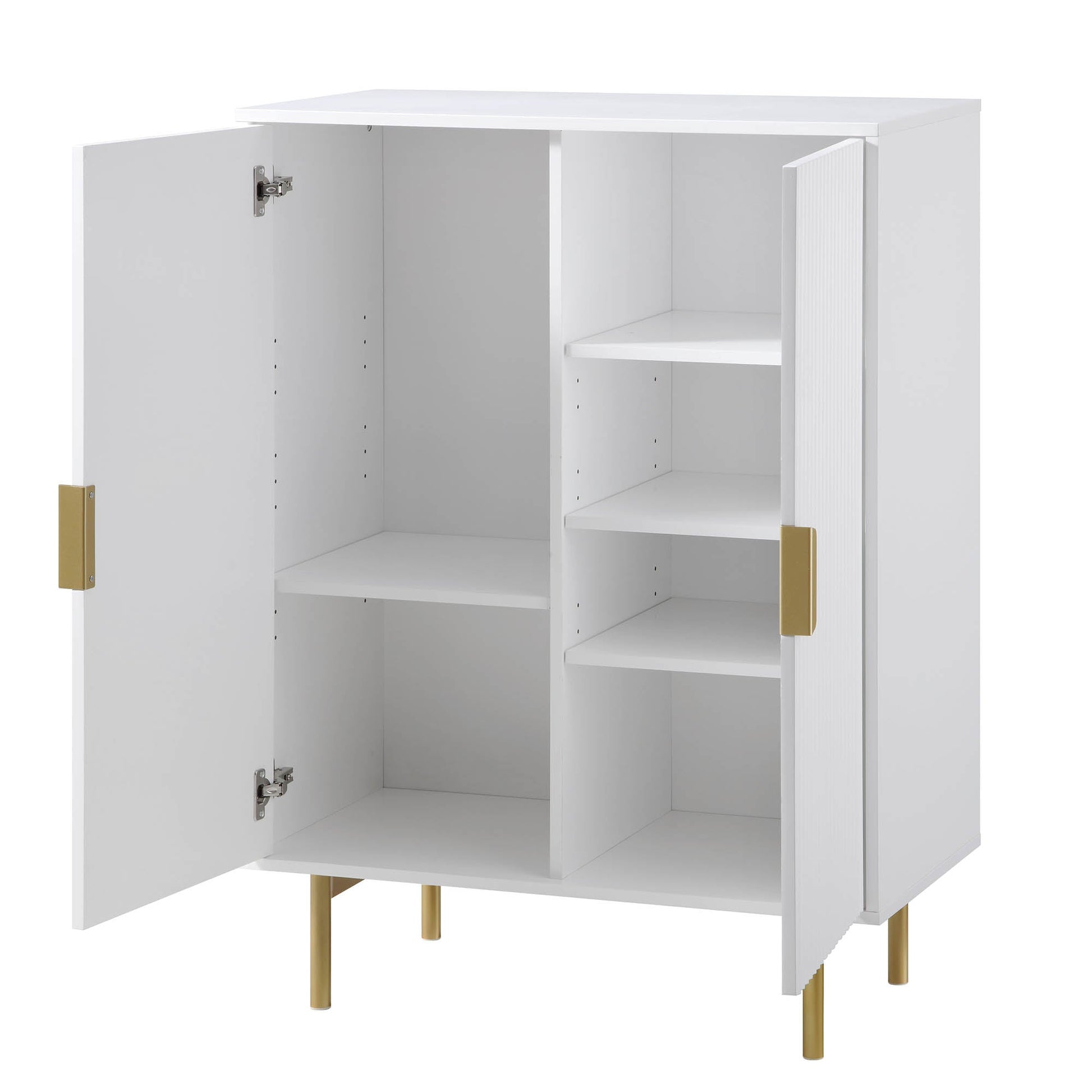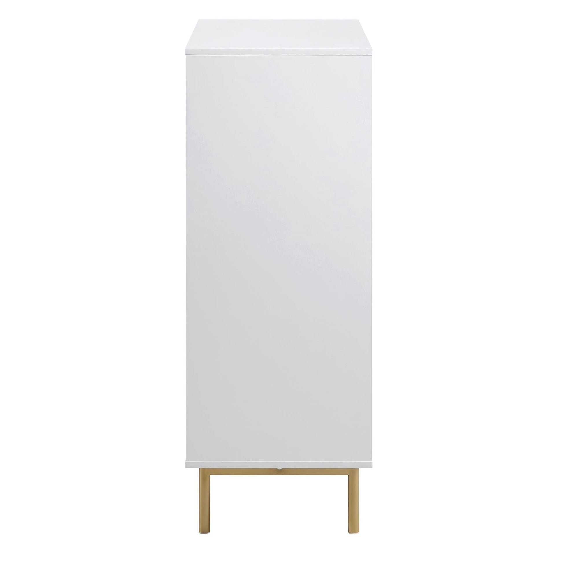 - The cabinet features ridged door surface finished in matte white paint, paired with gold handles and legs.