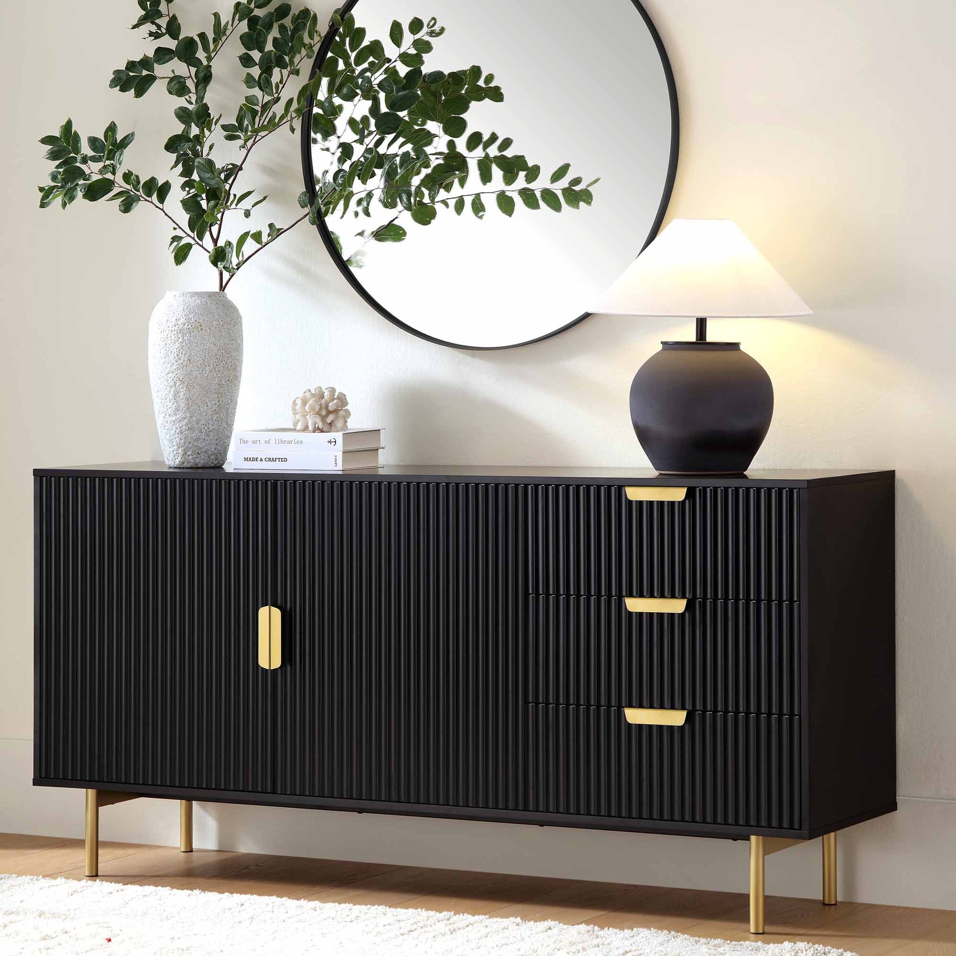 - The sideboard features ridged door surface finished in matte black paint, paired with gold handles and legs.