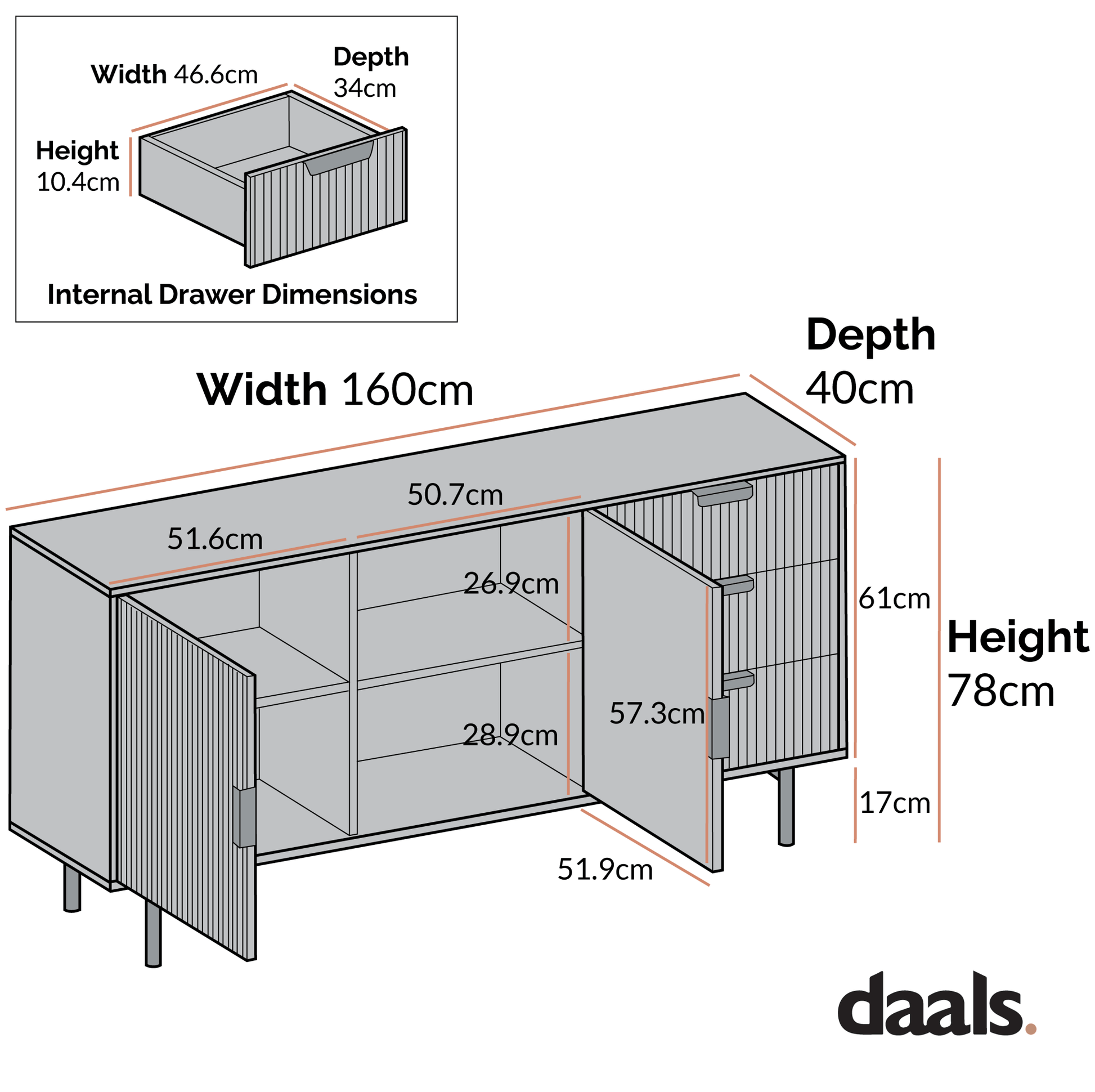 - It boasts ample storage space with 3 spacious drawers with metal runners, as well as two cupboards doors that open to reveal large cupboards with height adjustable shelves.