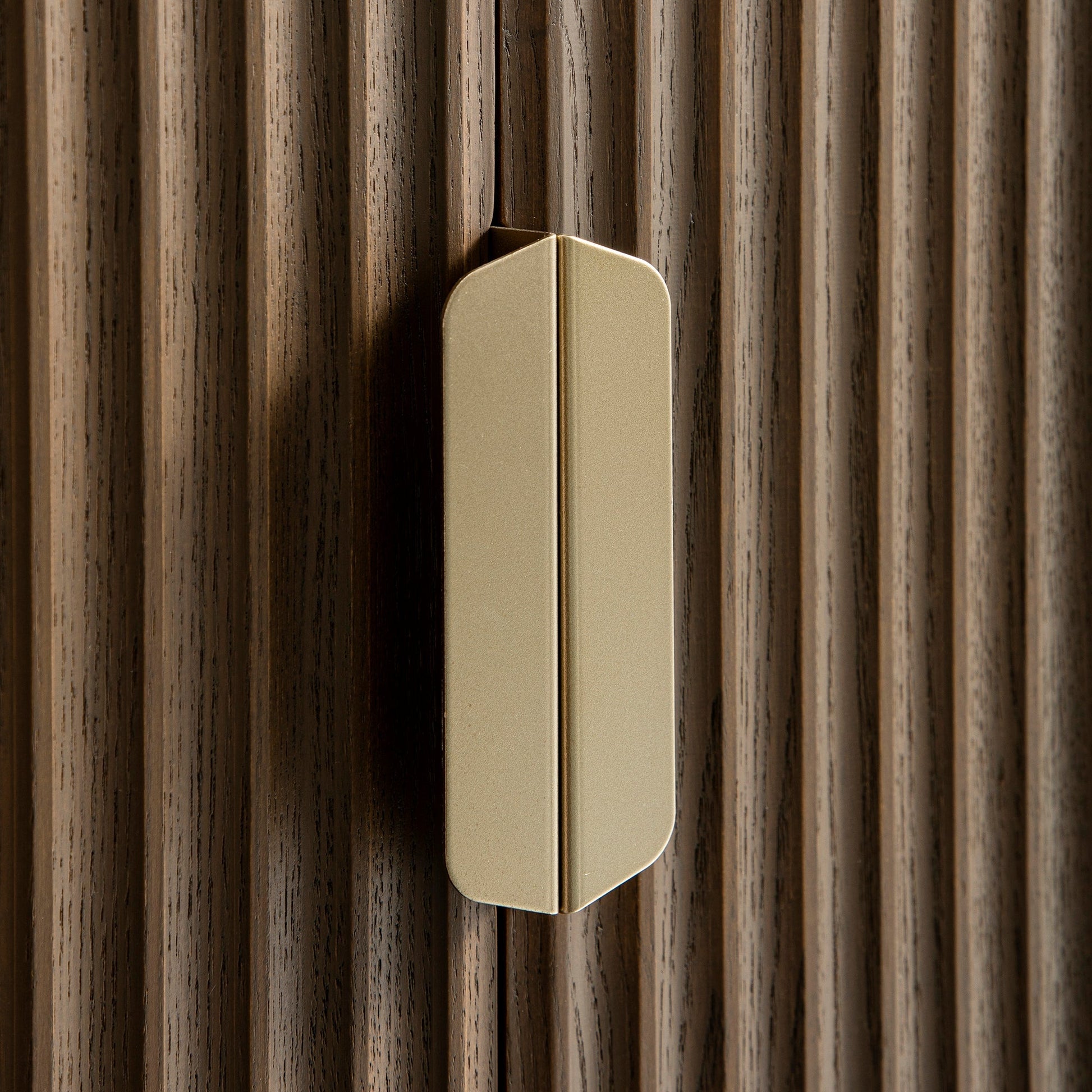 - The sideboard features ridged door surface finished in dark shaded stain, paired with gold handles and legs.