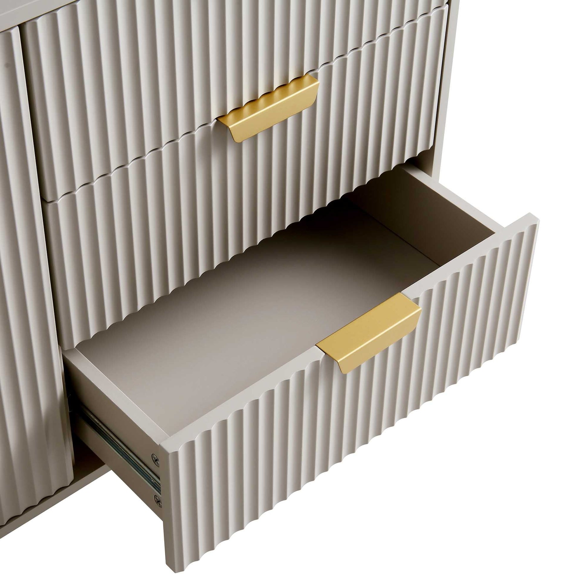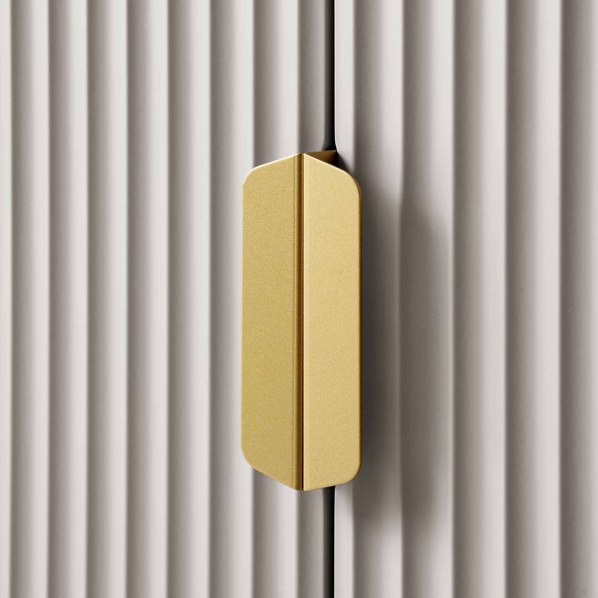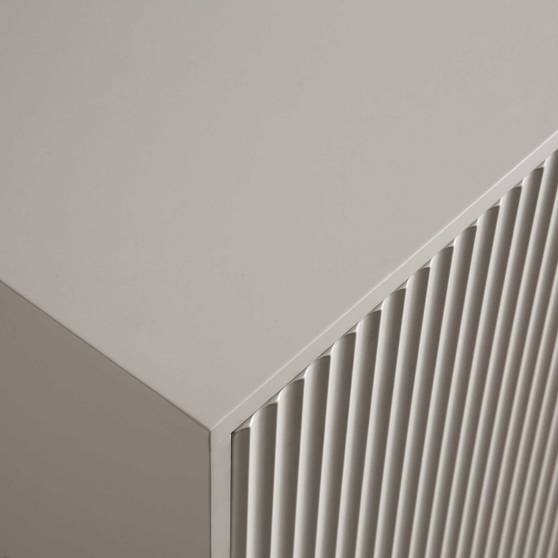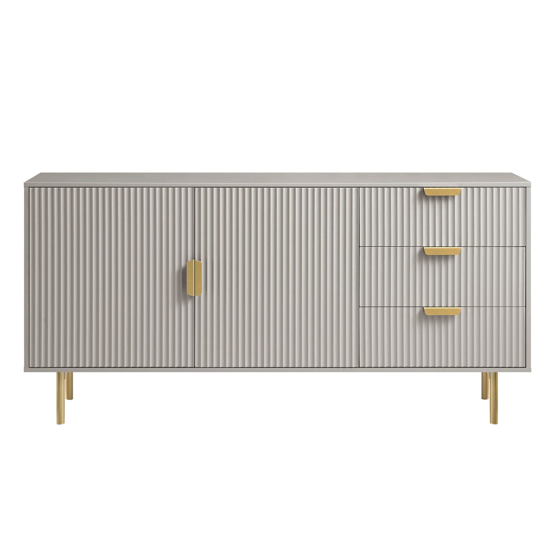 - The sideboard features ridged door surface finished in matte taupe paint, paired with gold handles and legs.