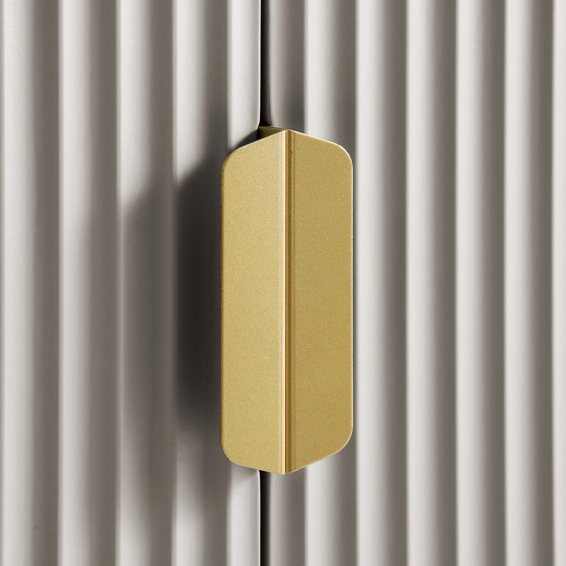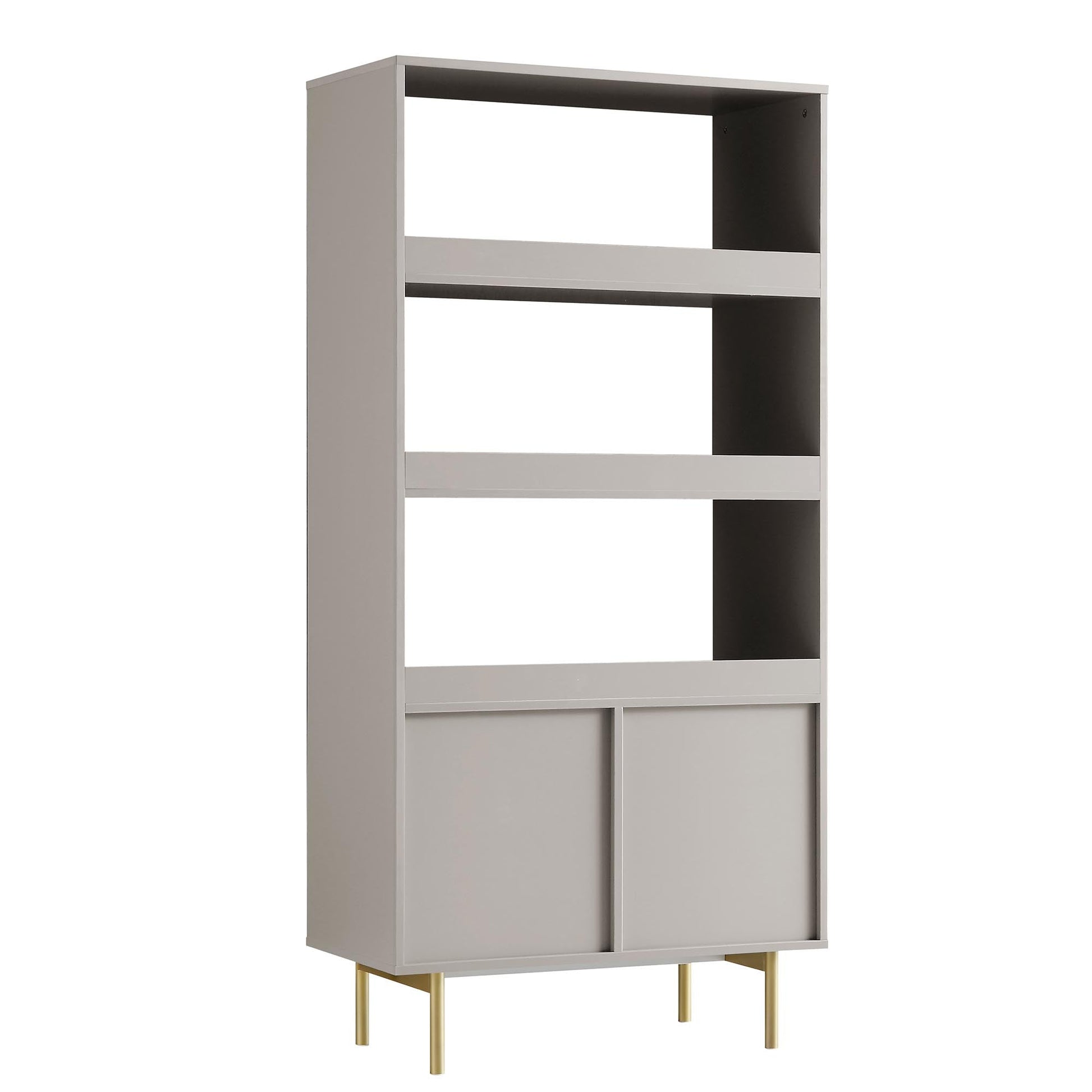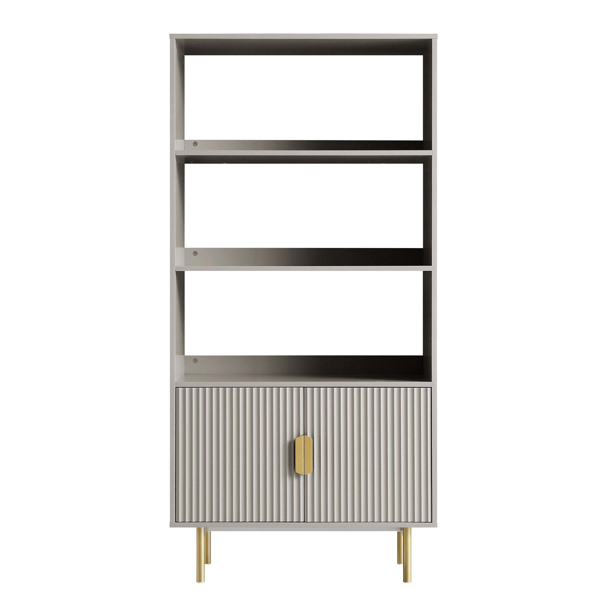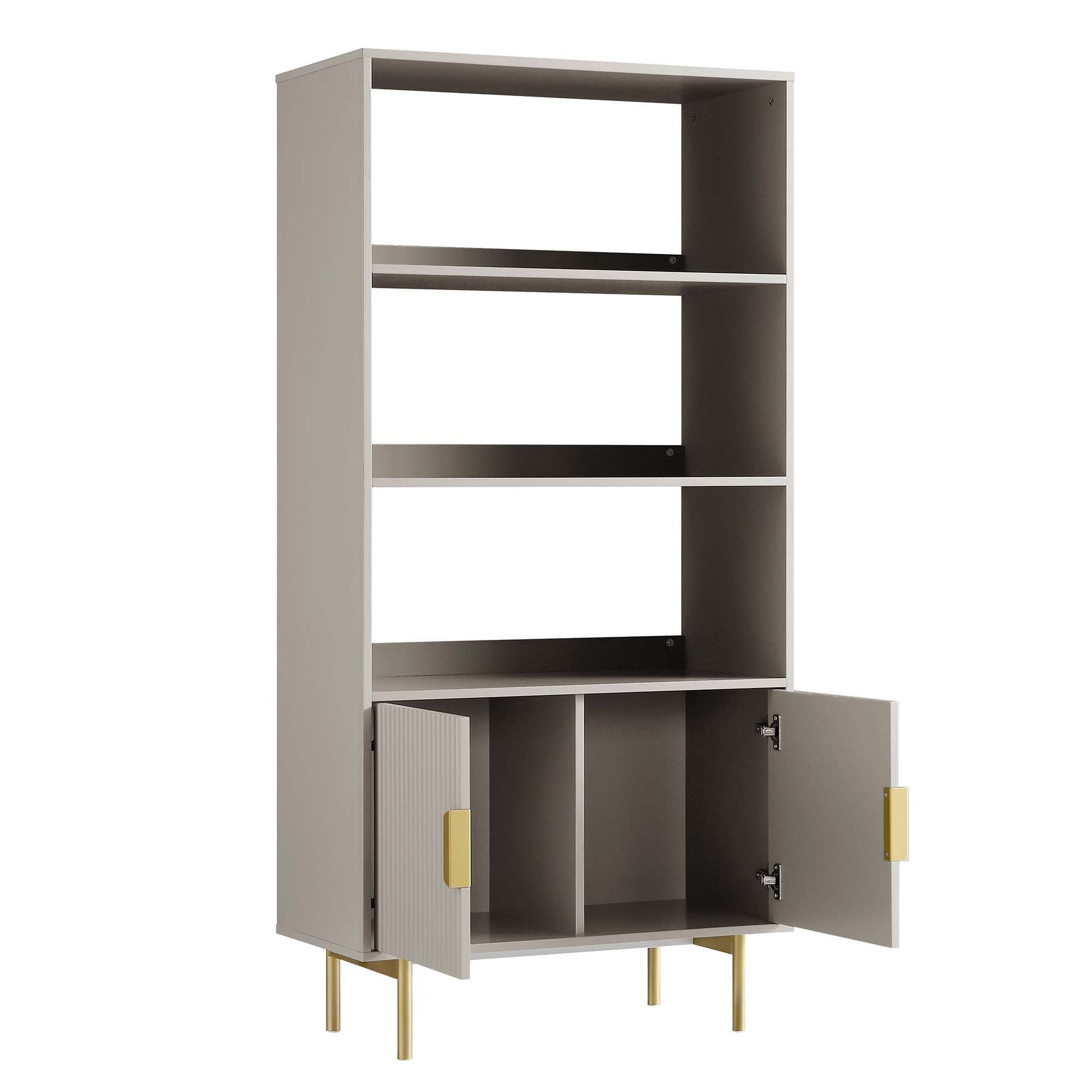 - The bookcase features ridged door surface finished in matte taupe paint, paired with gold handles on the doors and matching legs.