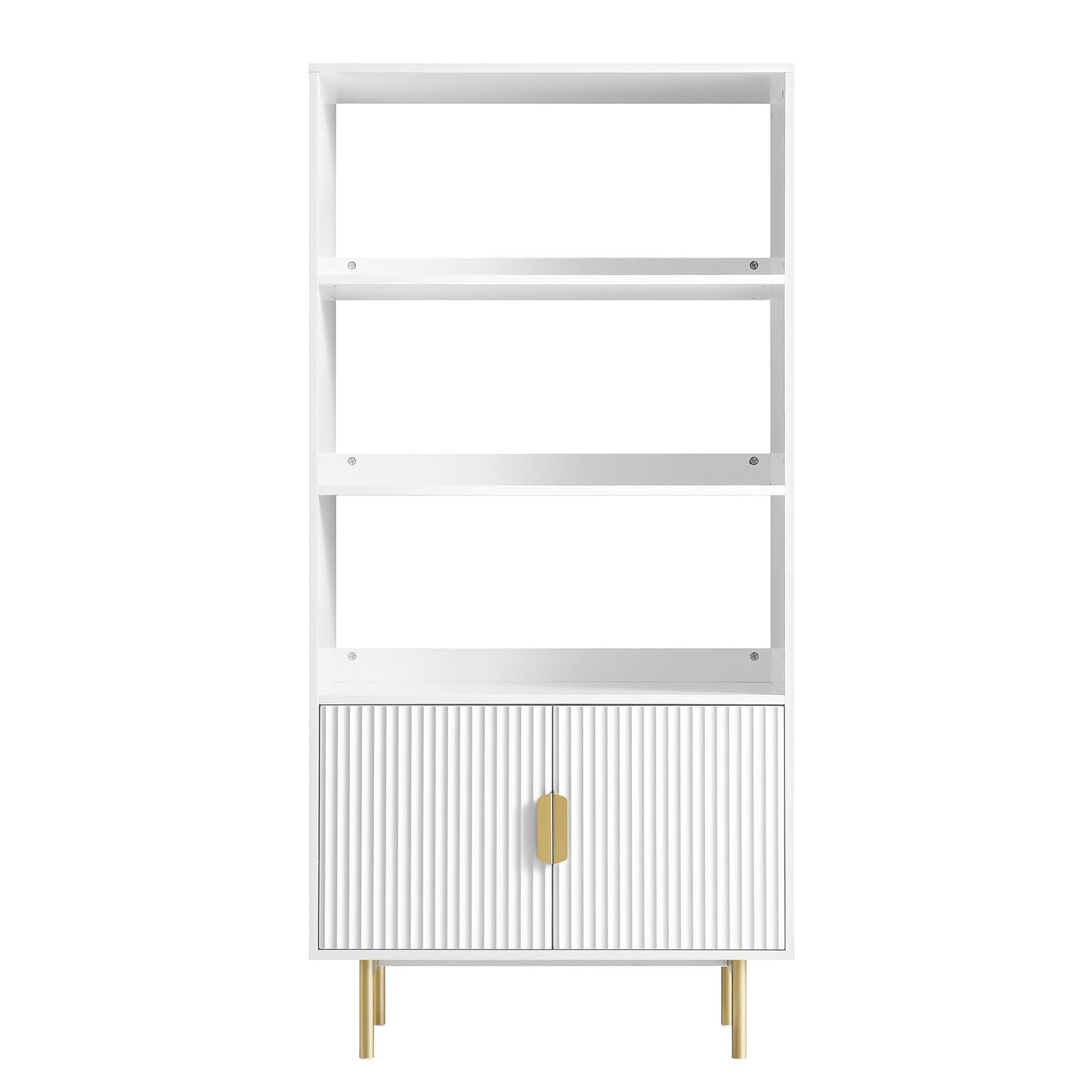 - The bookcase features ridged door surface finished in matte white paint, paired with gold handles on the doors and matching legs.