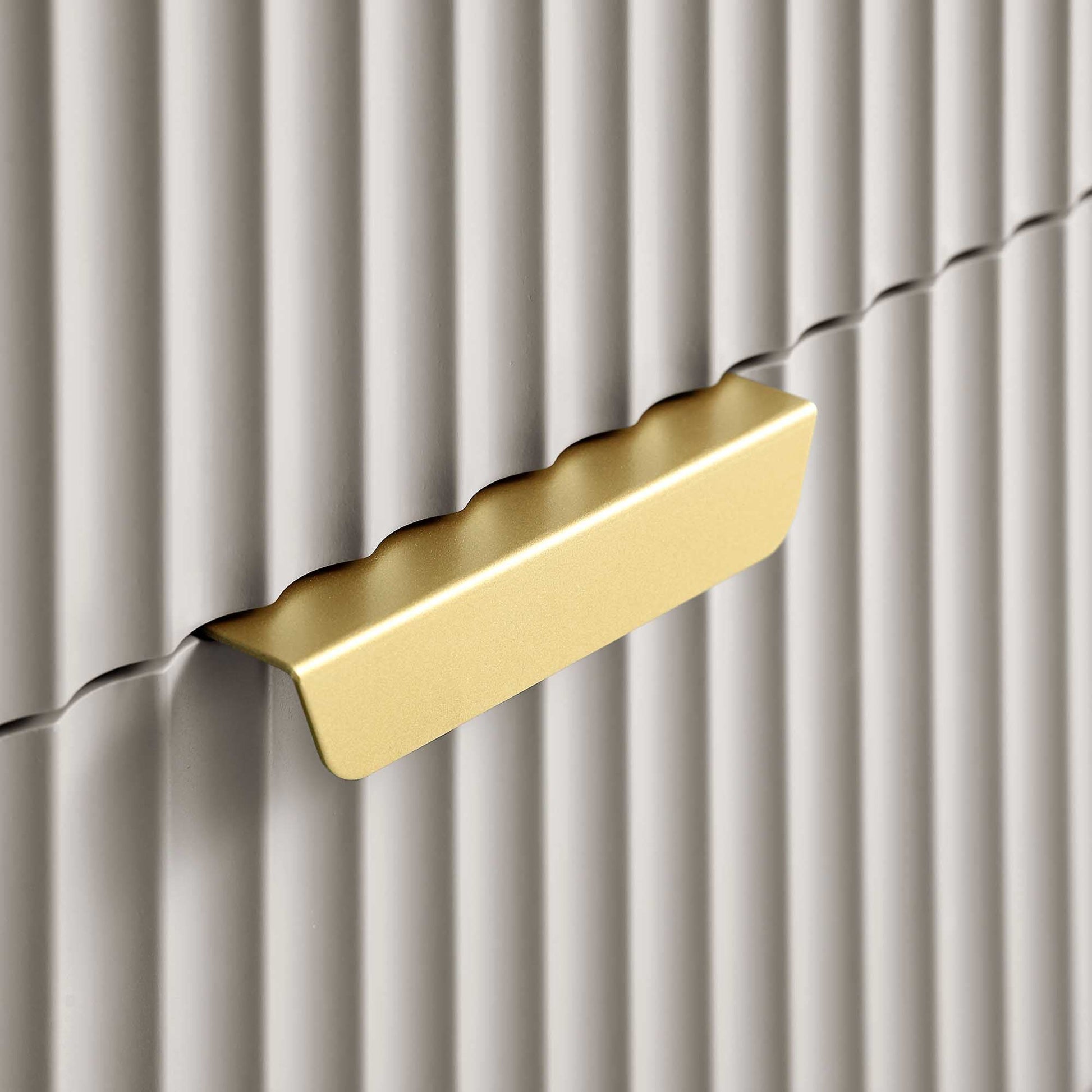 - Ridged door surface finished in matte taupe paint, paired with gold handles and legs give a striking stylish look.